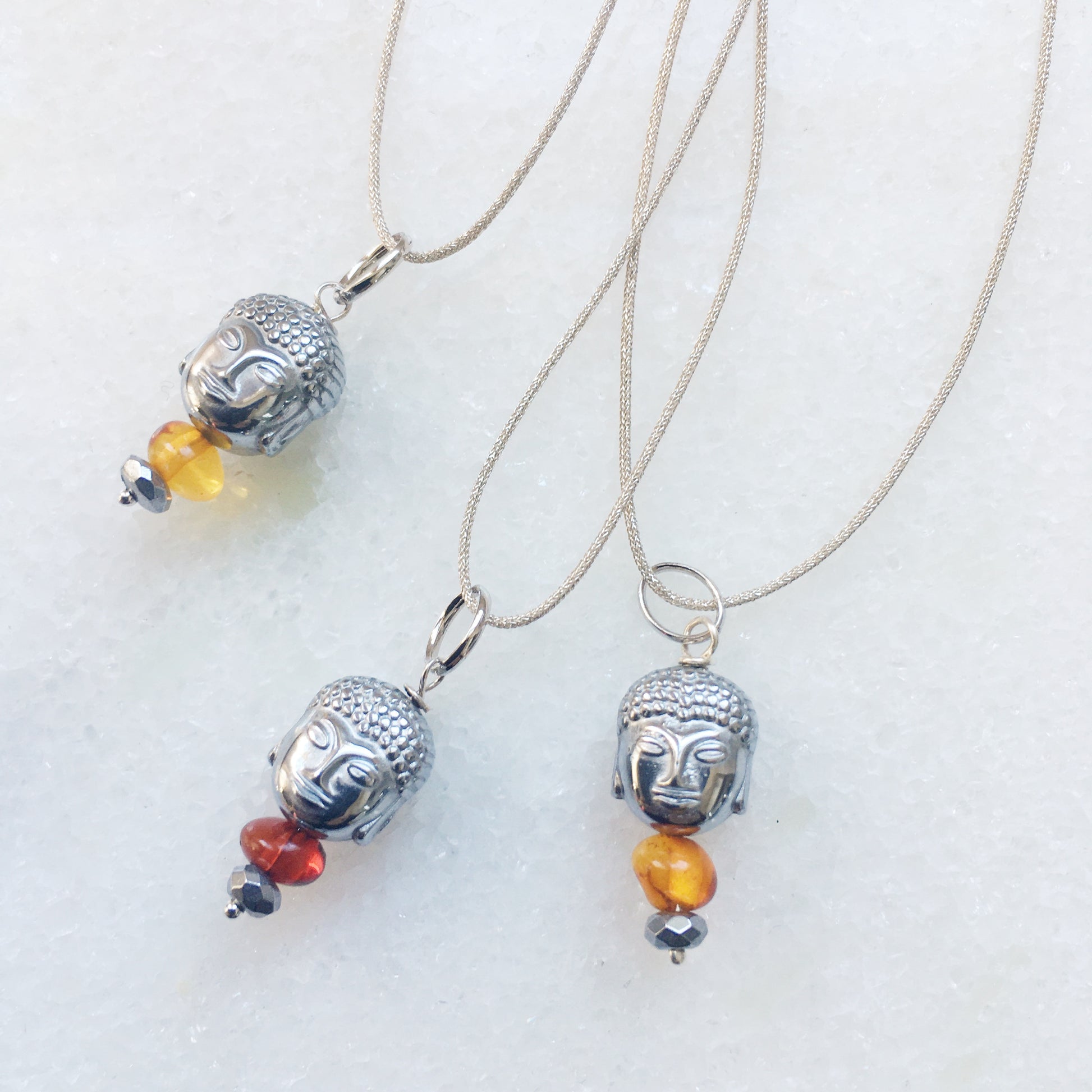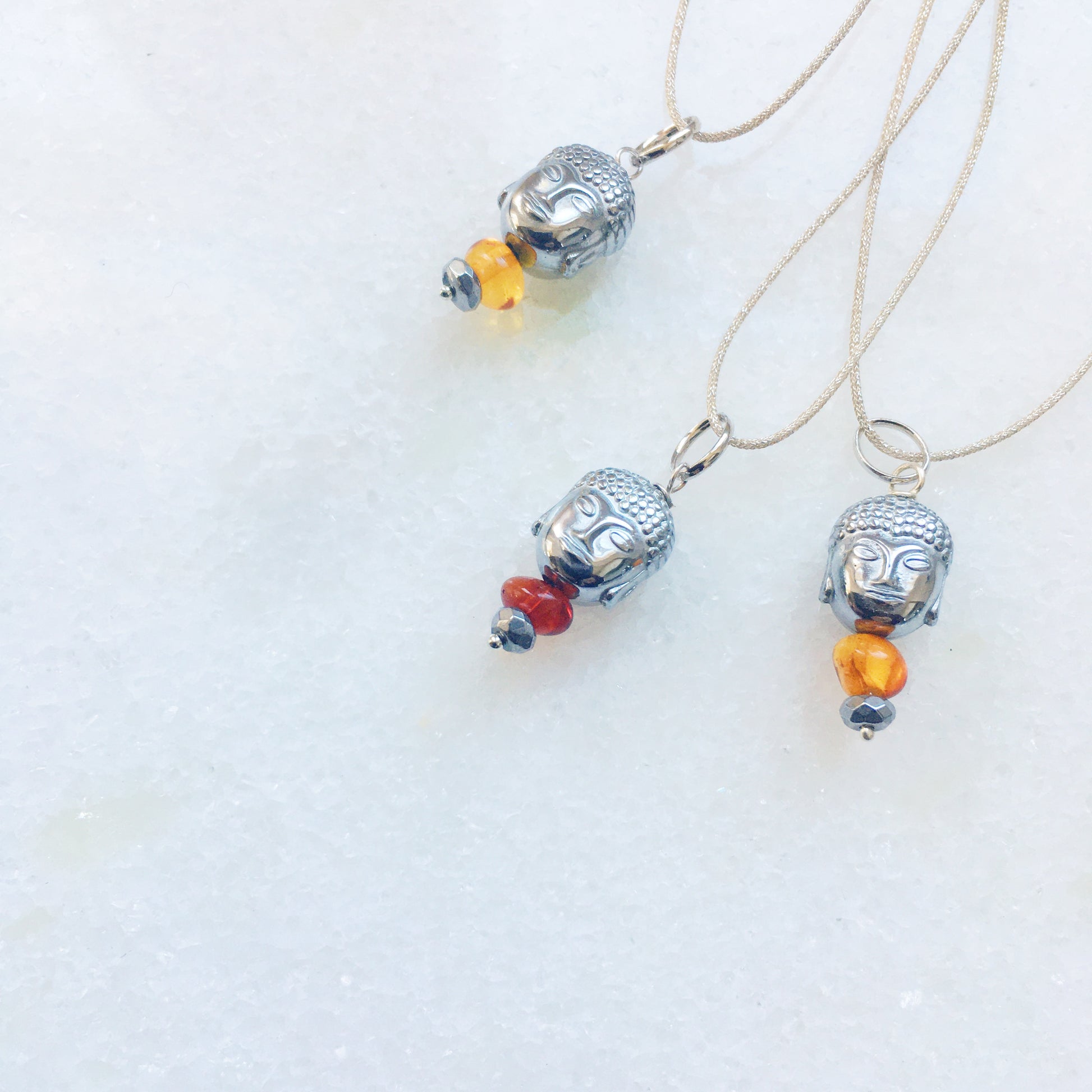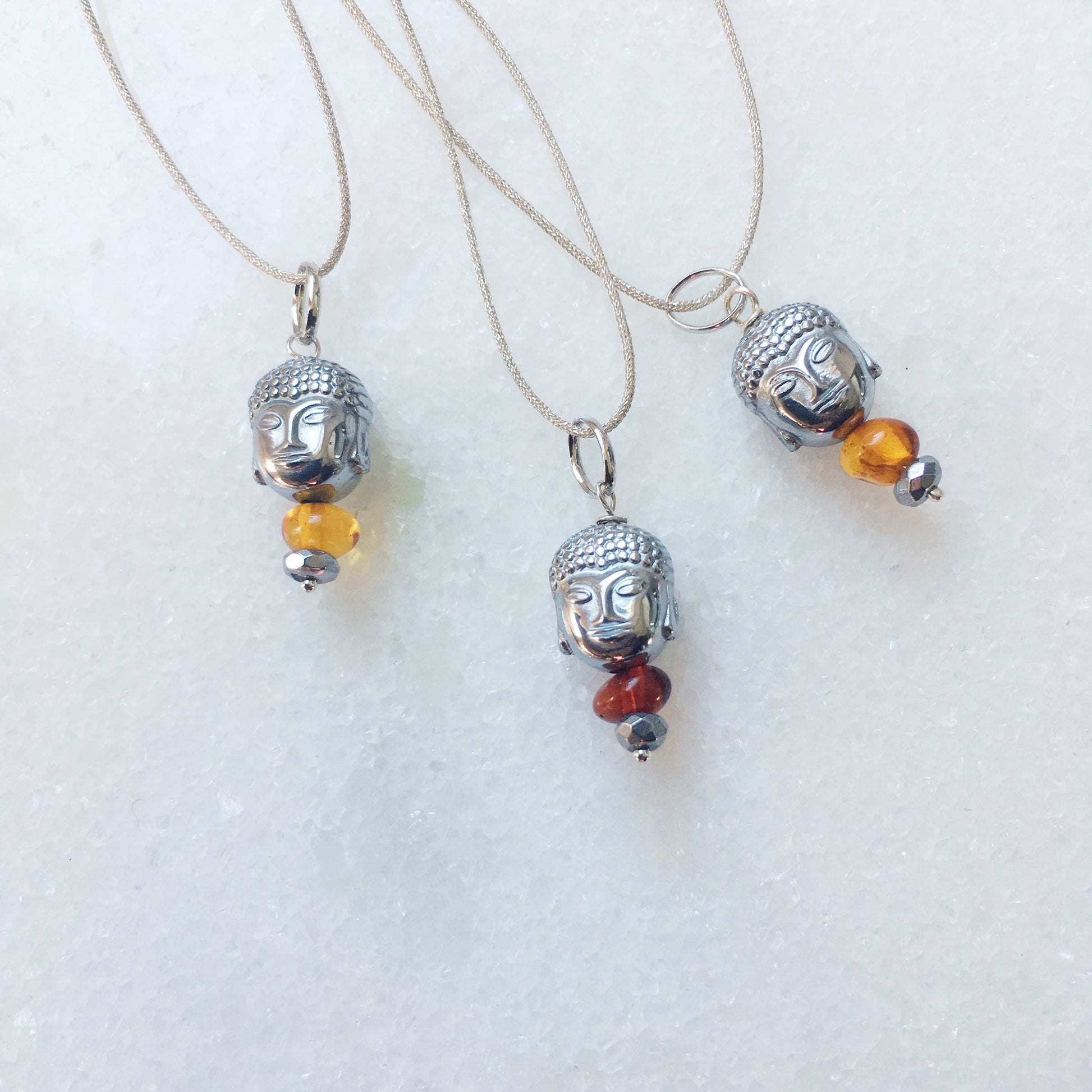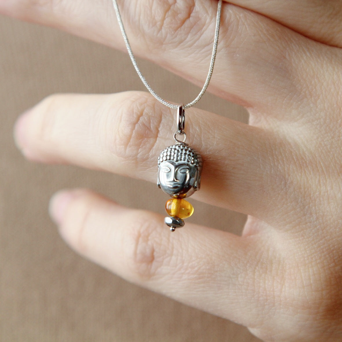 Ciondolo Buddha in ematite ed ambra del baltico: arancio o gialla.