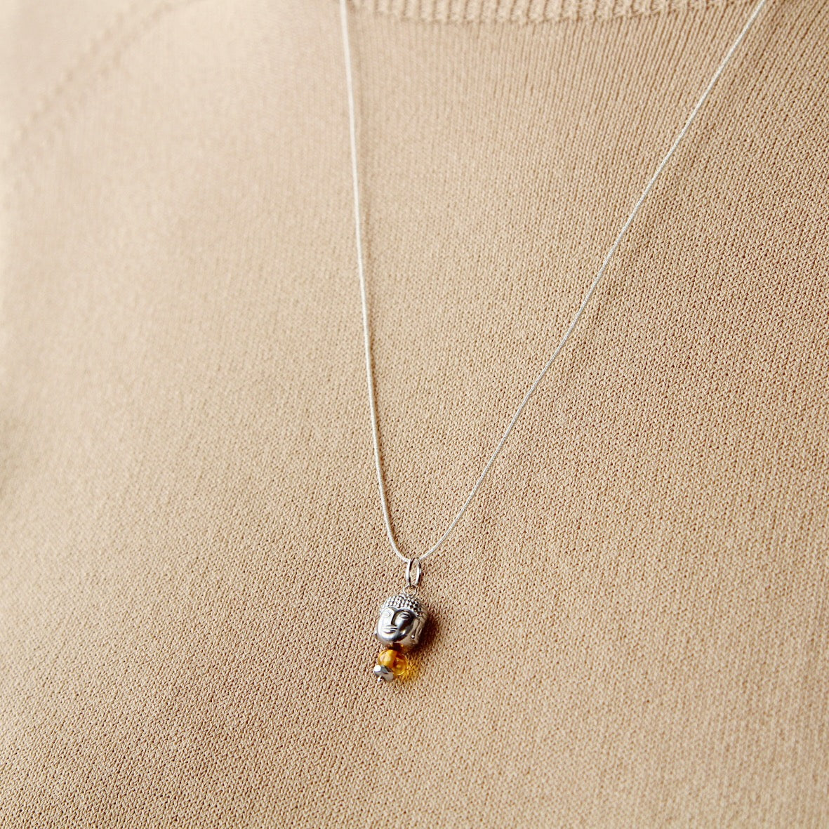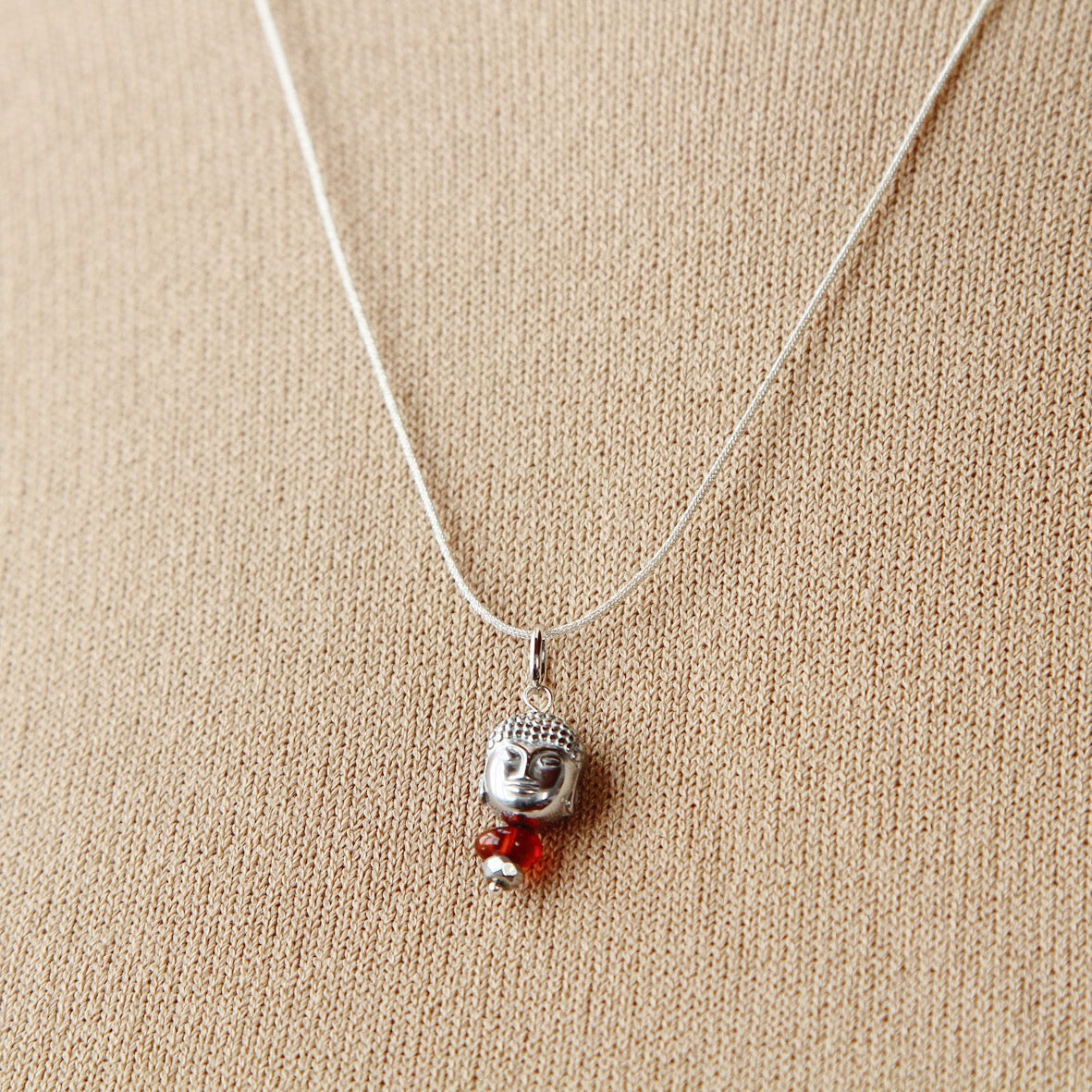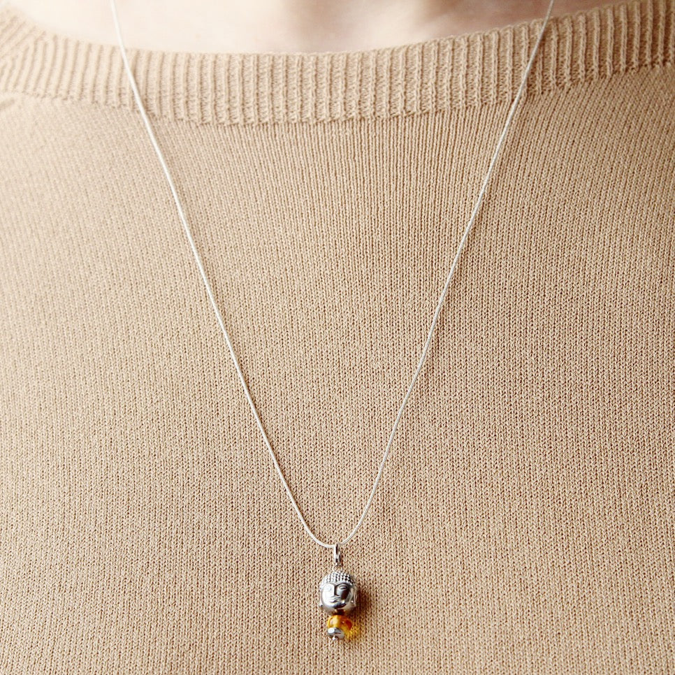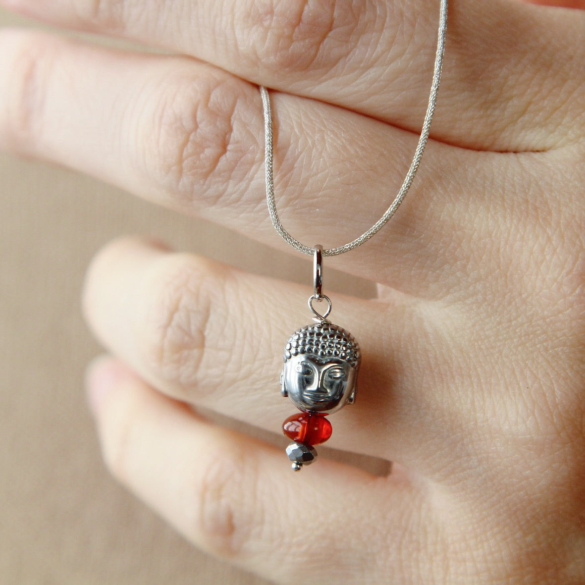 Ciondolo Buddha in ematite ed ambra del baltico: arancio o gialla.