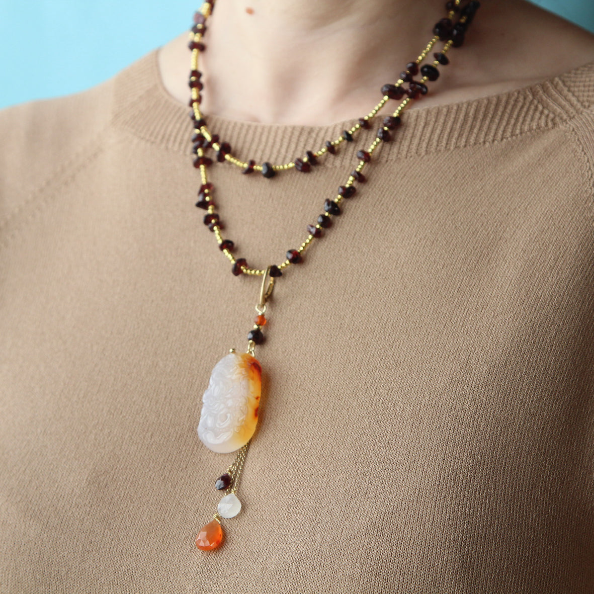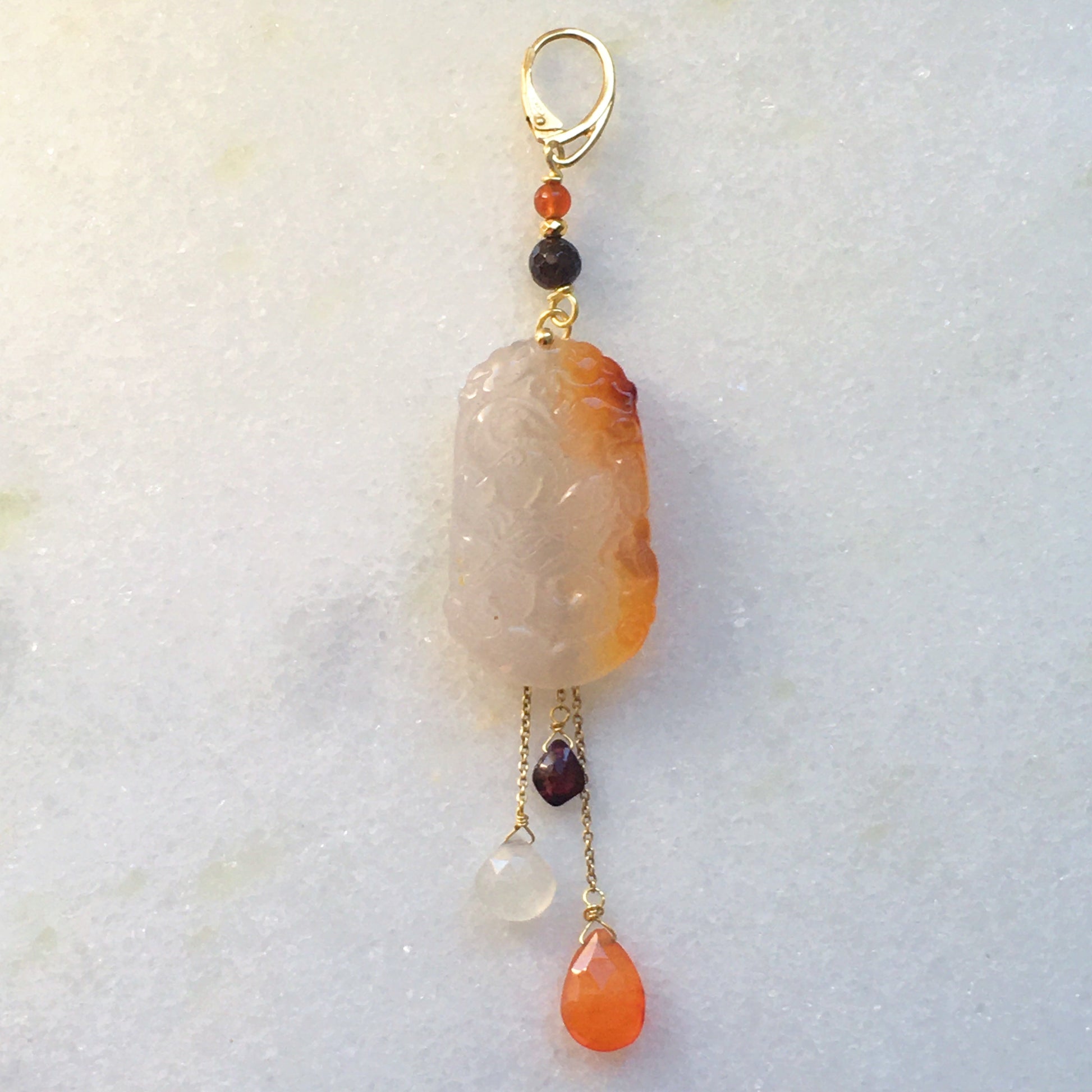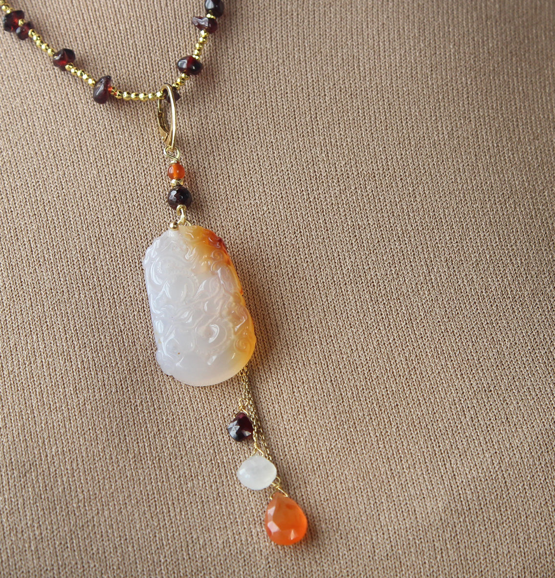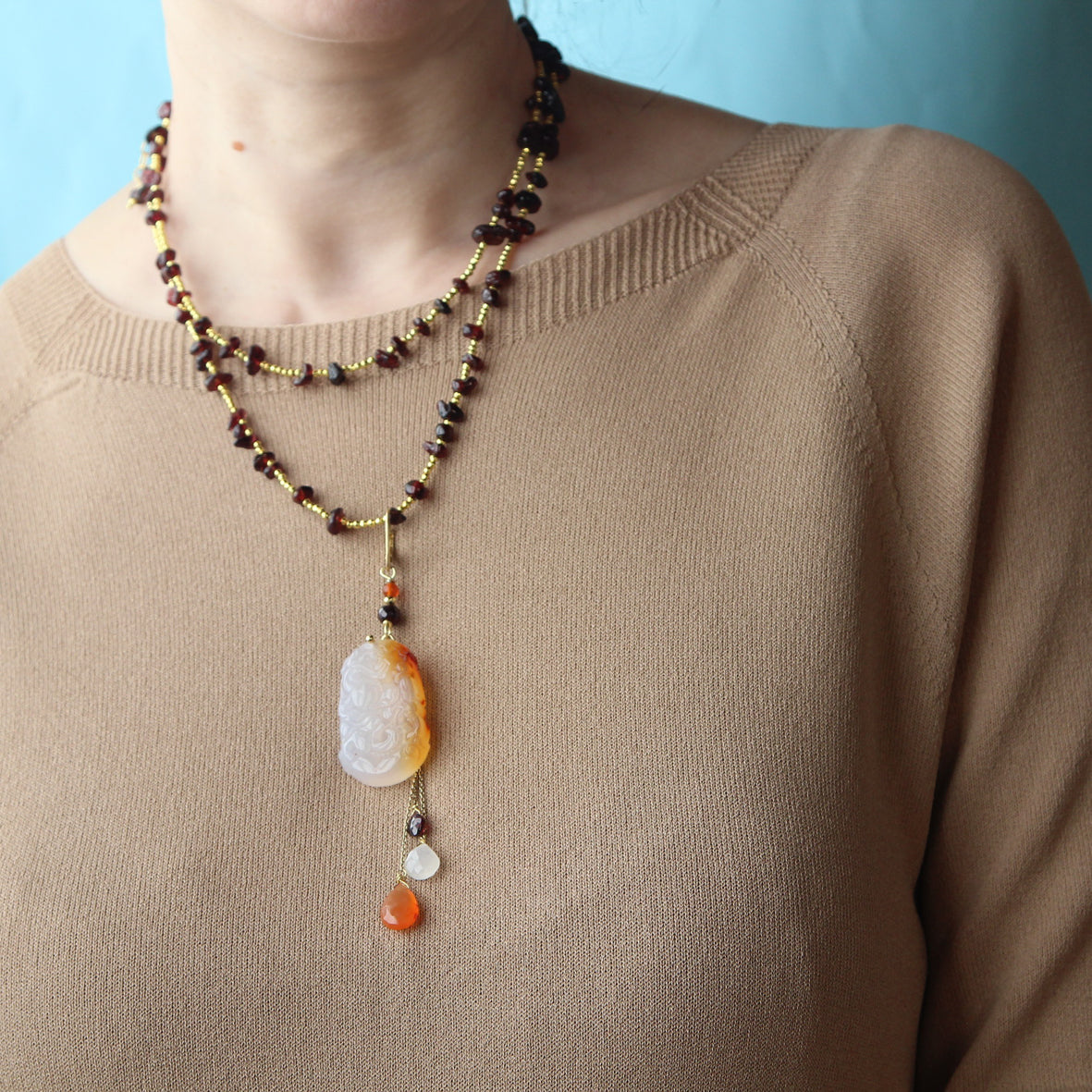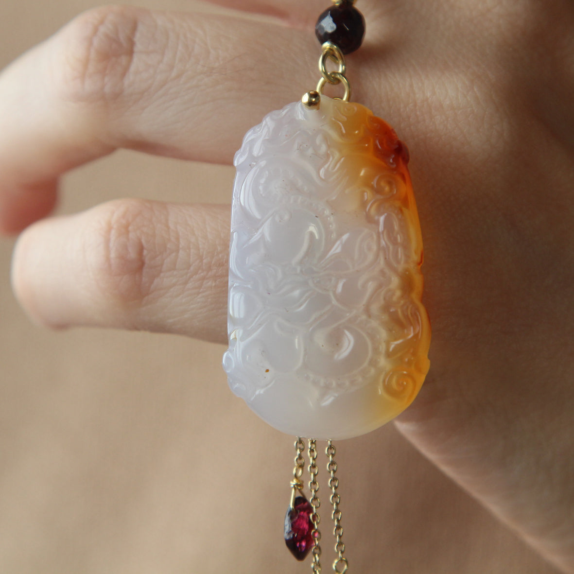 Ciondolo unico creato con una corniola intagliata raffigurante un drago, potente simbolo di protezione nella cultura orientale.