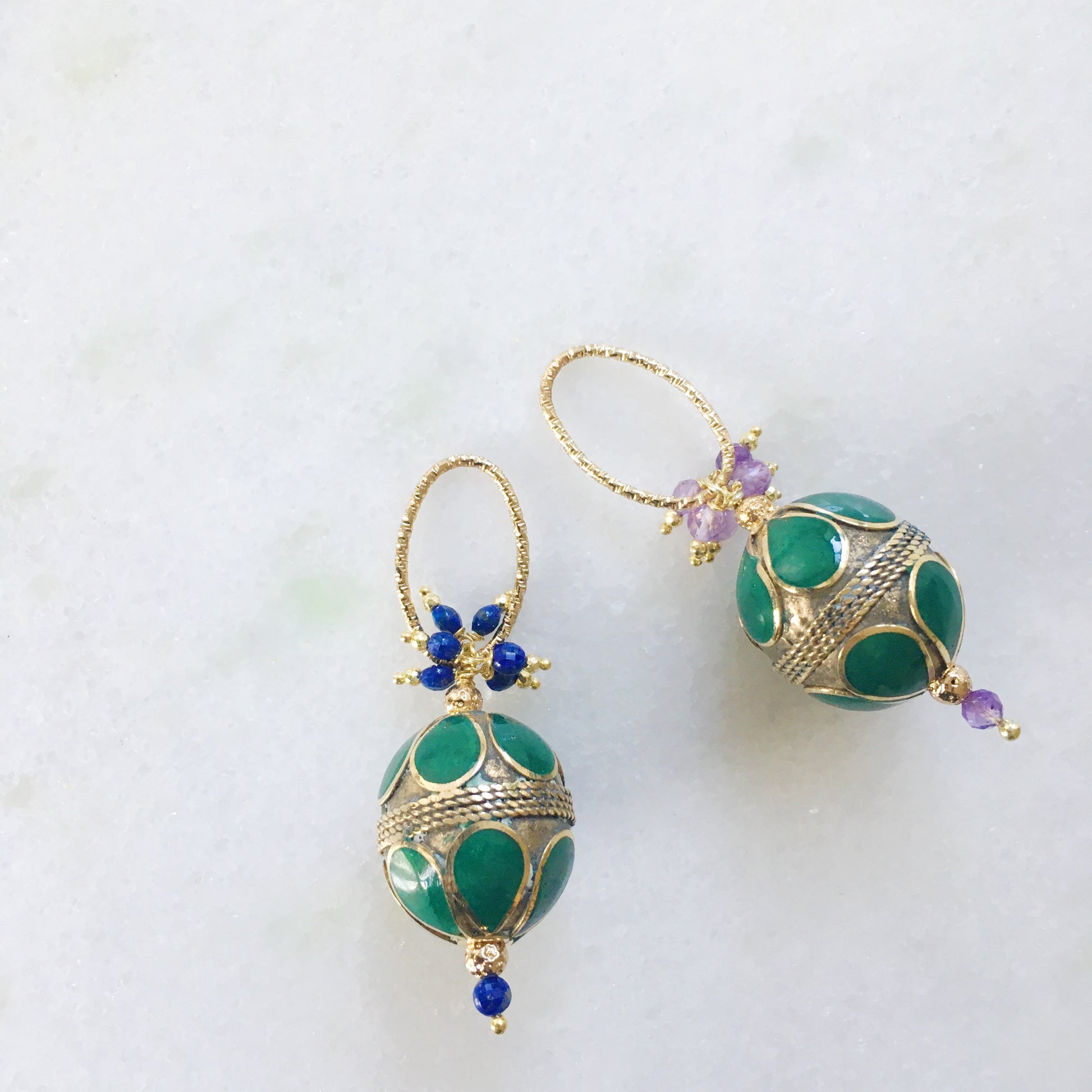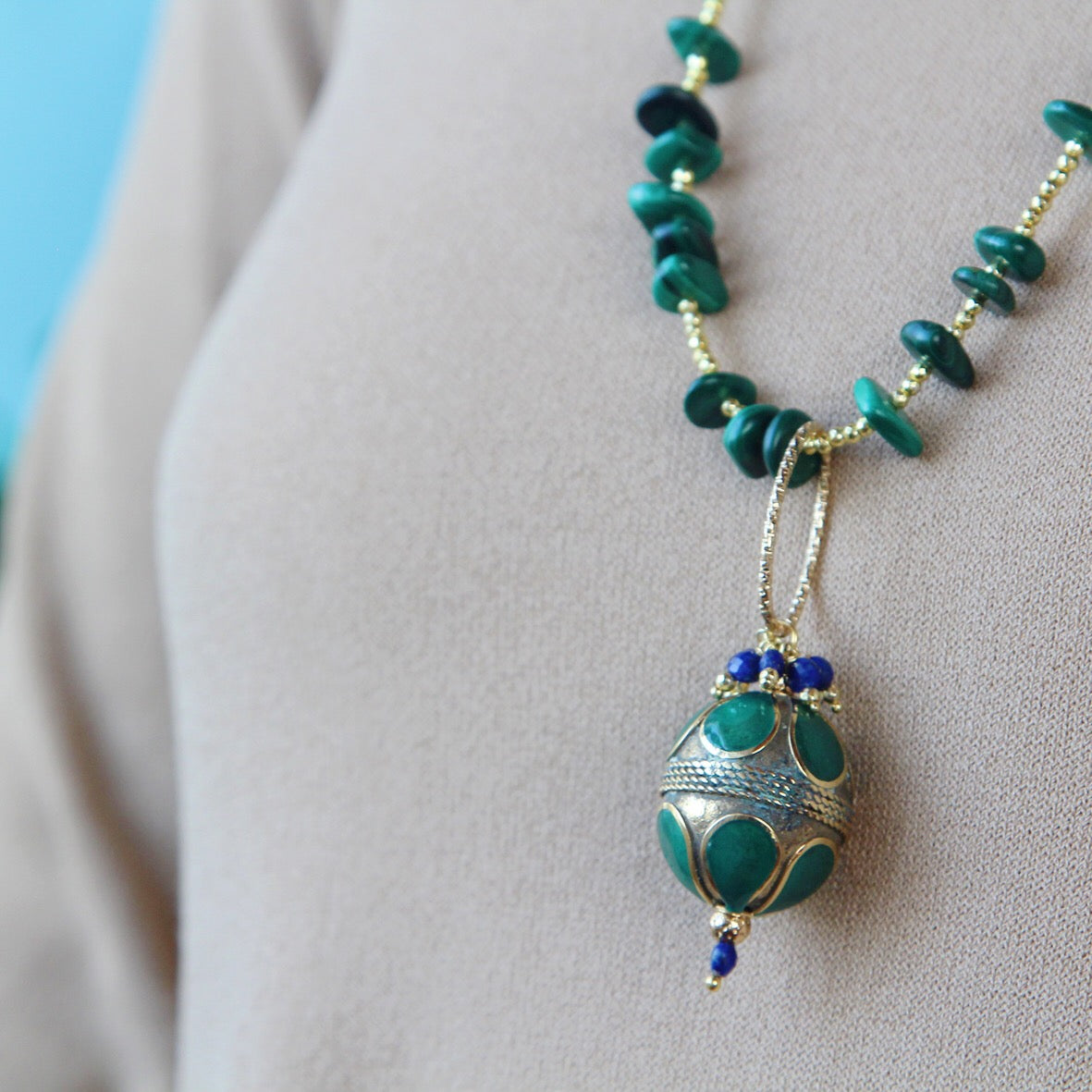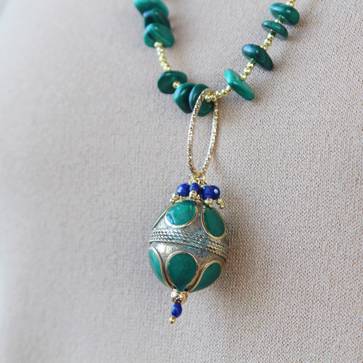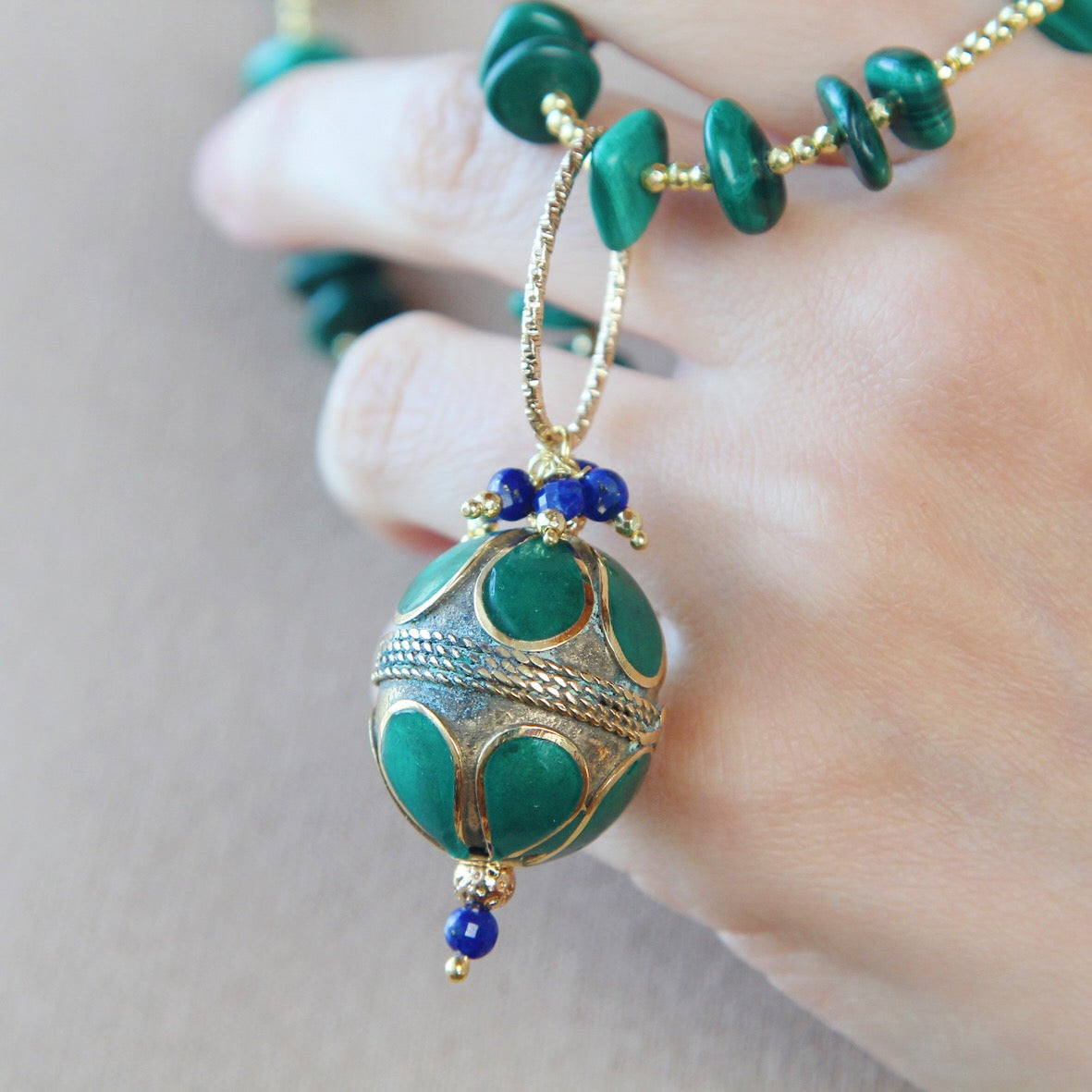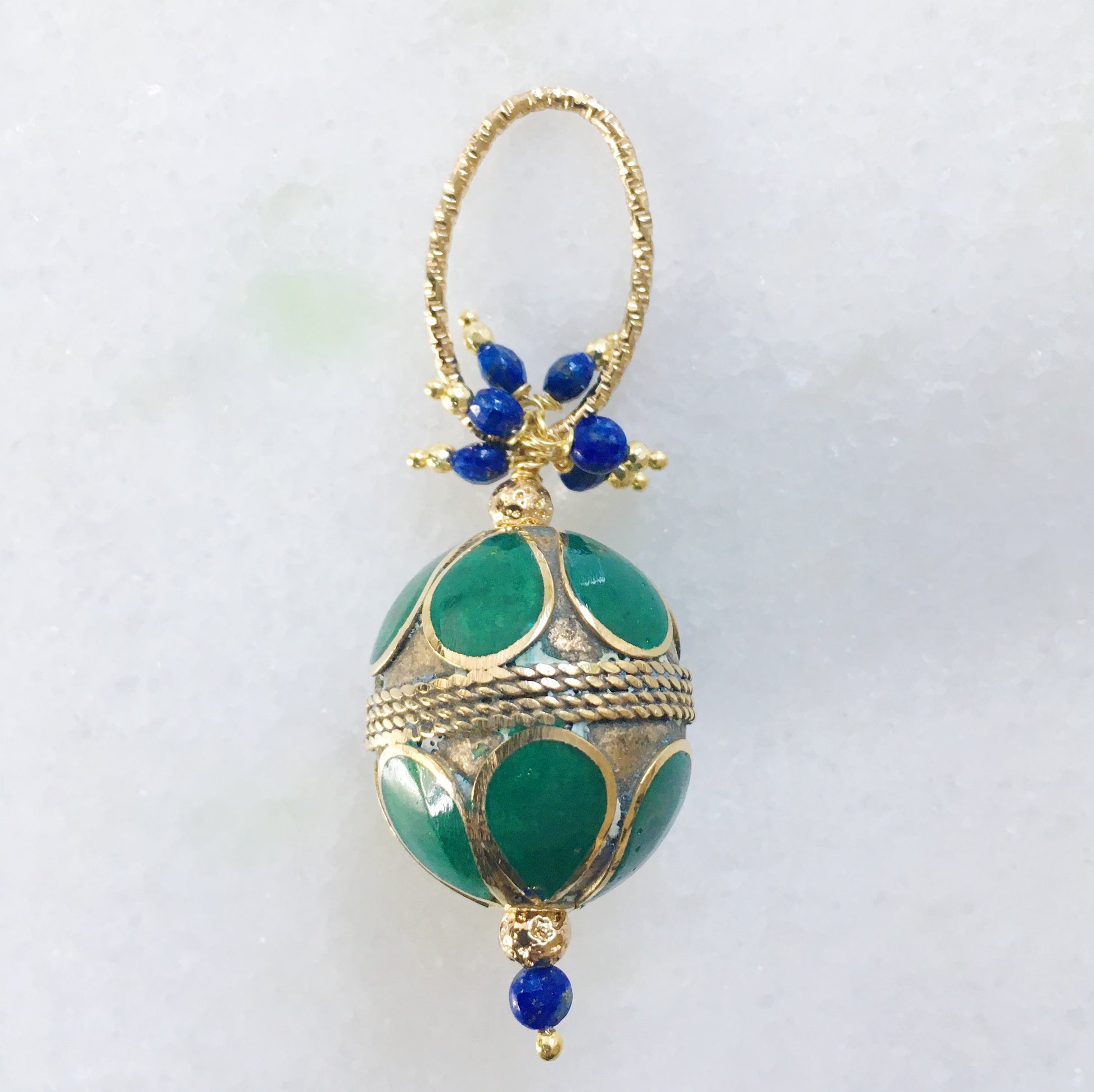 Un fantastico amuleto creato con una sfera vintage etnica e pietrine di lapislazzuli.