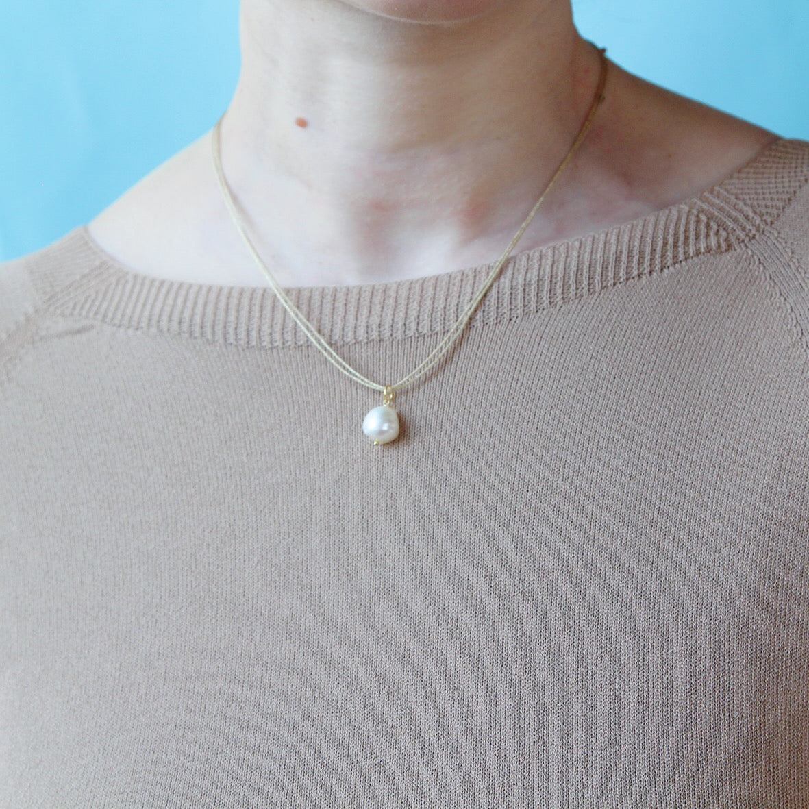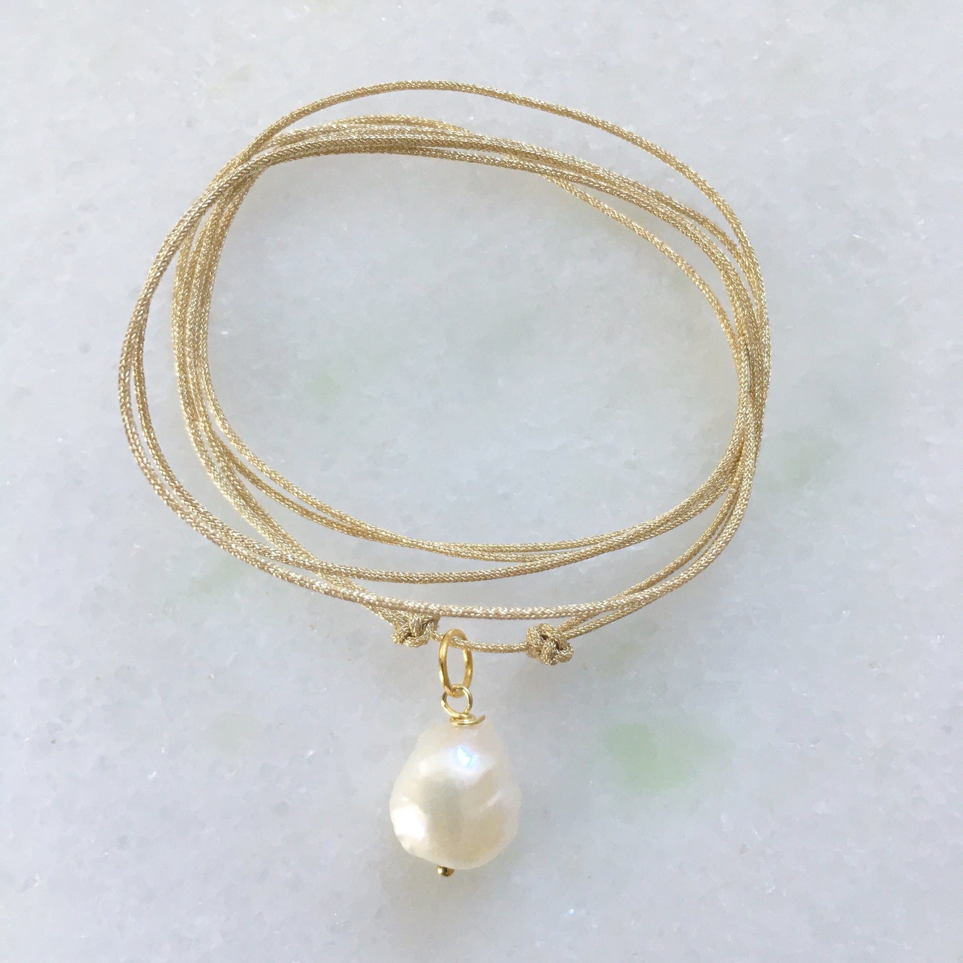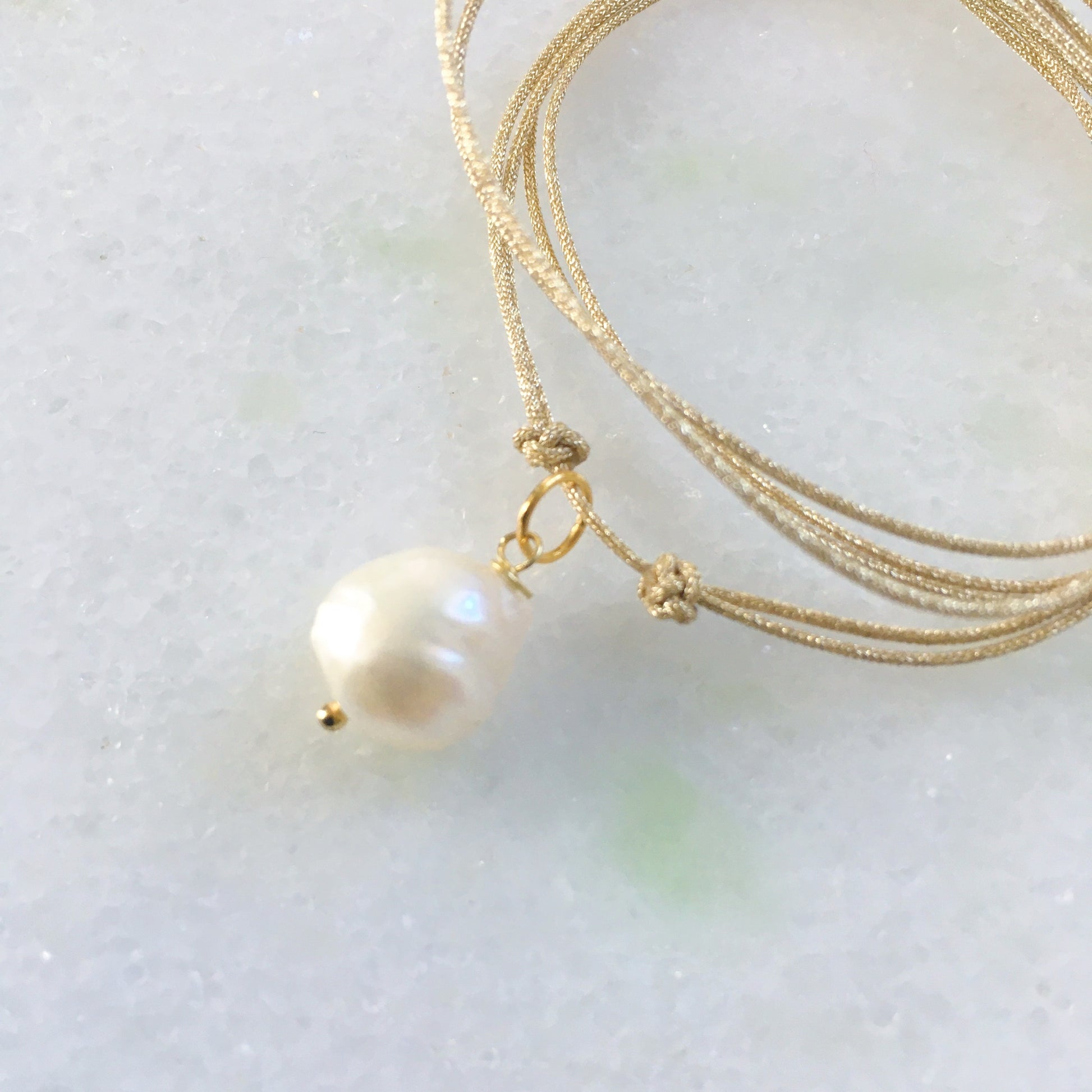 Materiali: cordino in tessuto argento o dorato, perla montata in argento.