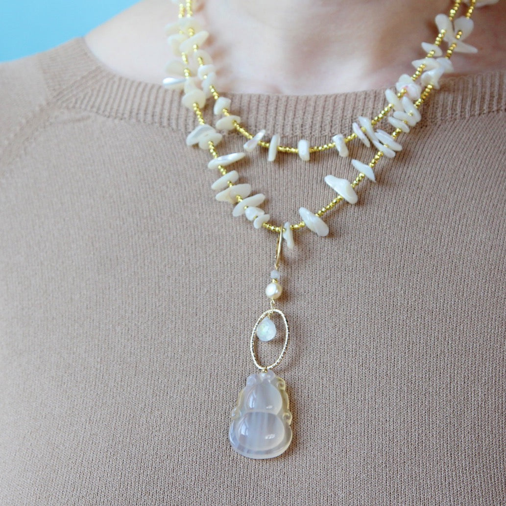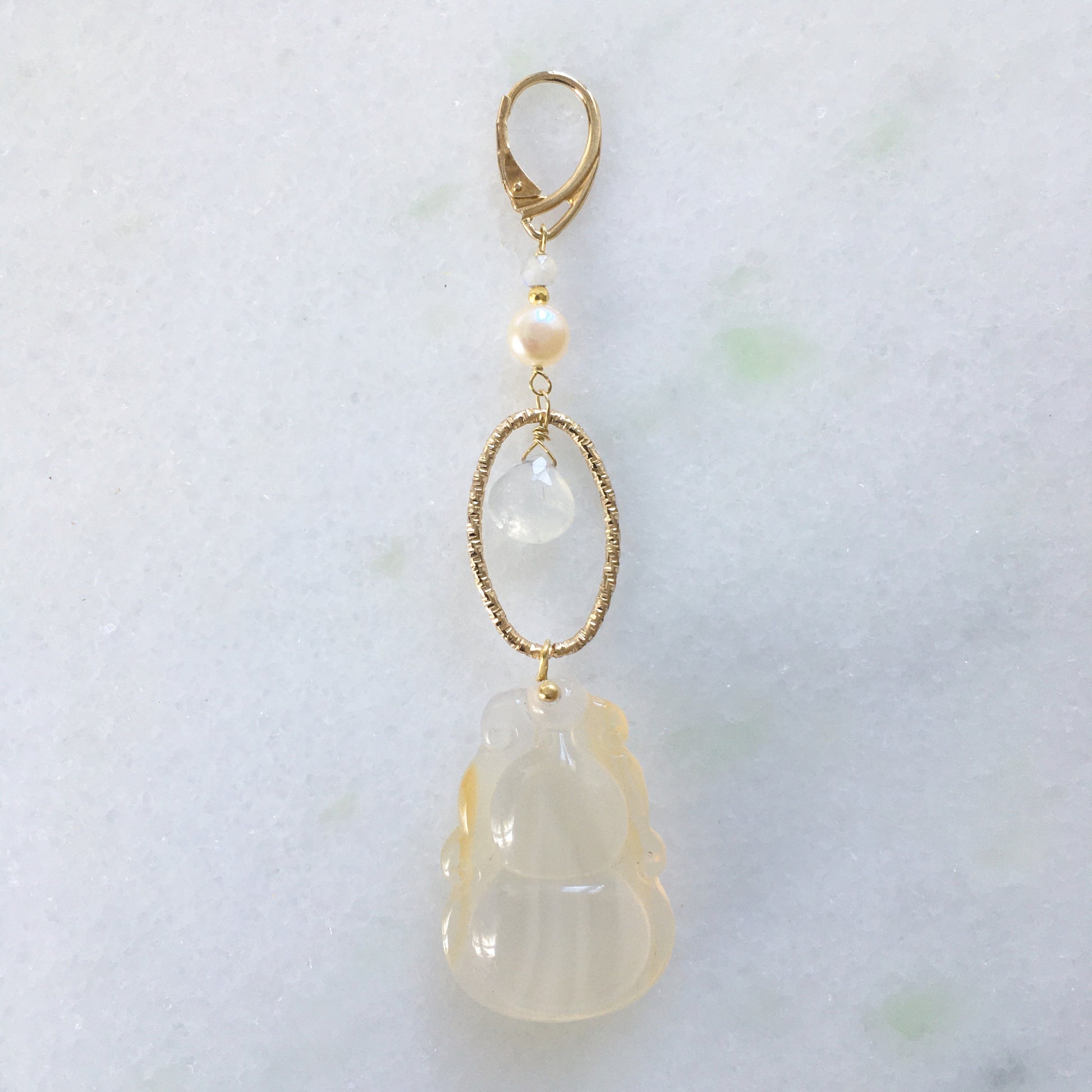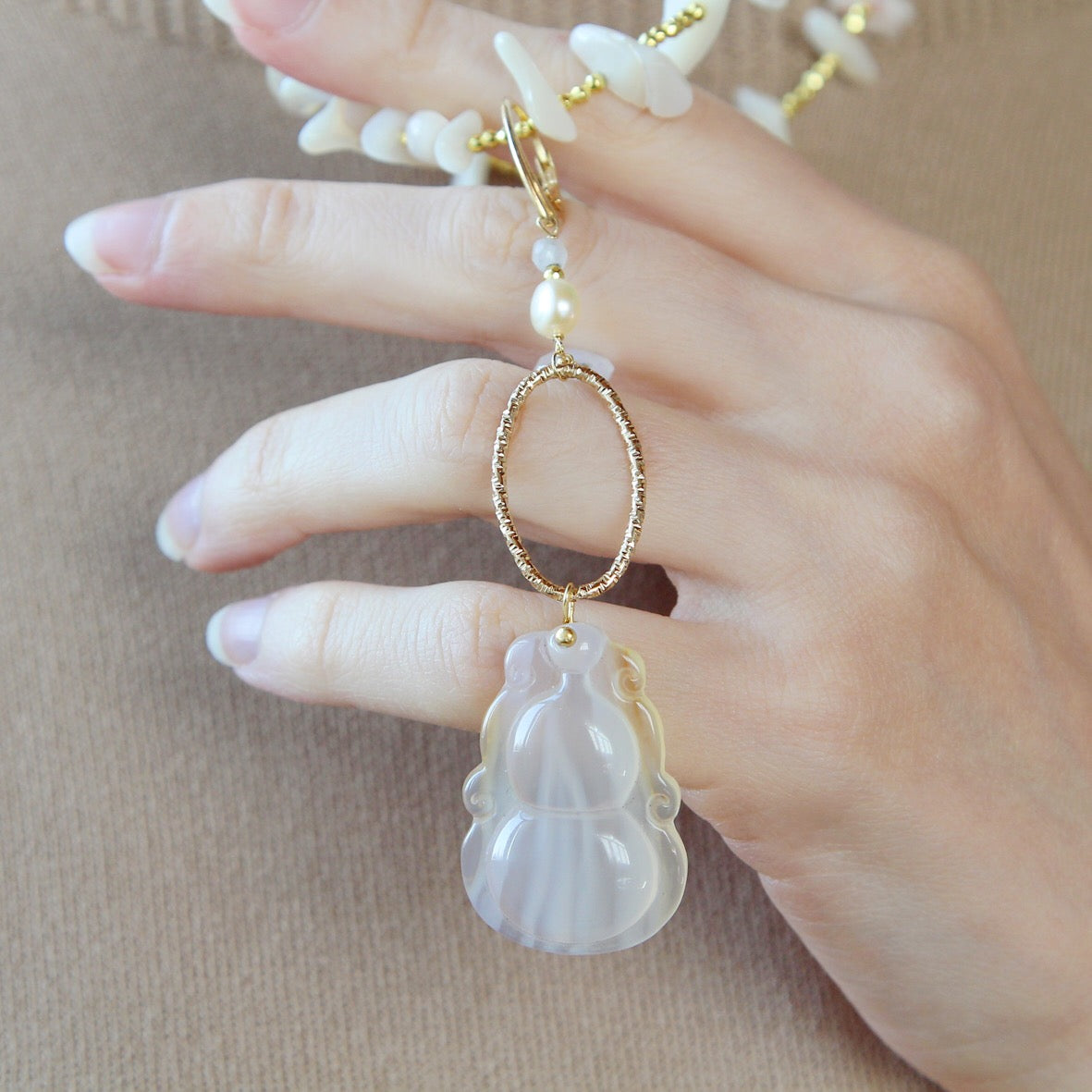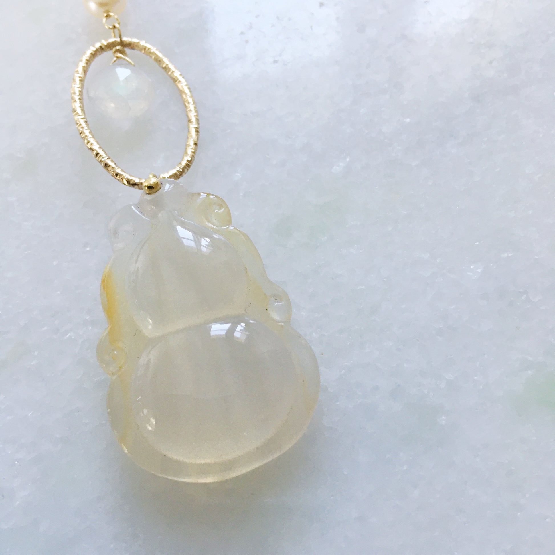 Questa bellissima zucca cinese intagliata nell’agata è impreziosita da pietre di luna, perla, inserto ovale vintage ed ematite dorata e un elegante gancio in argento 925 in bagno d'oro.
