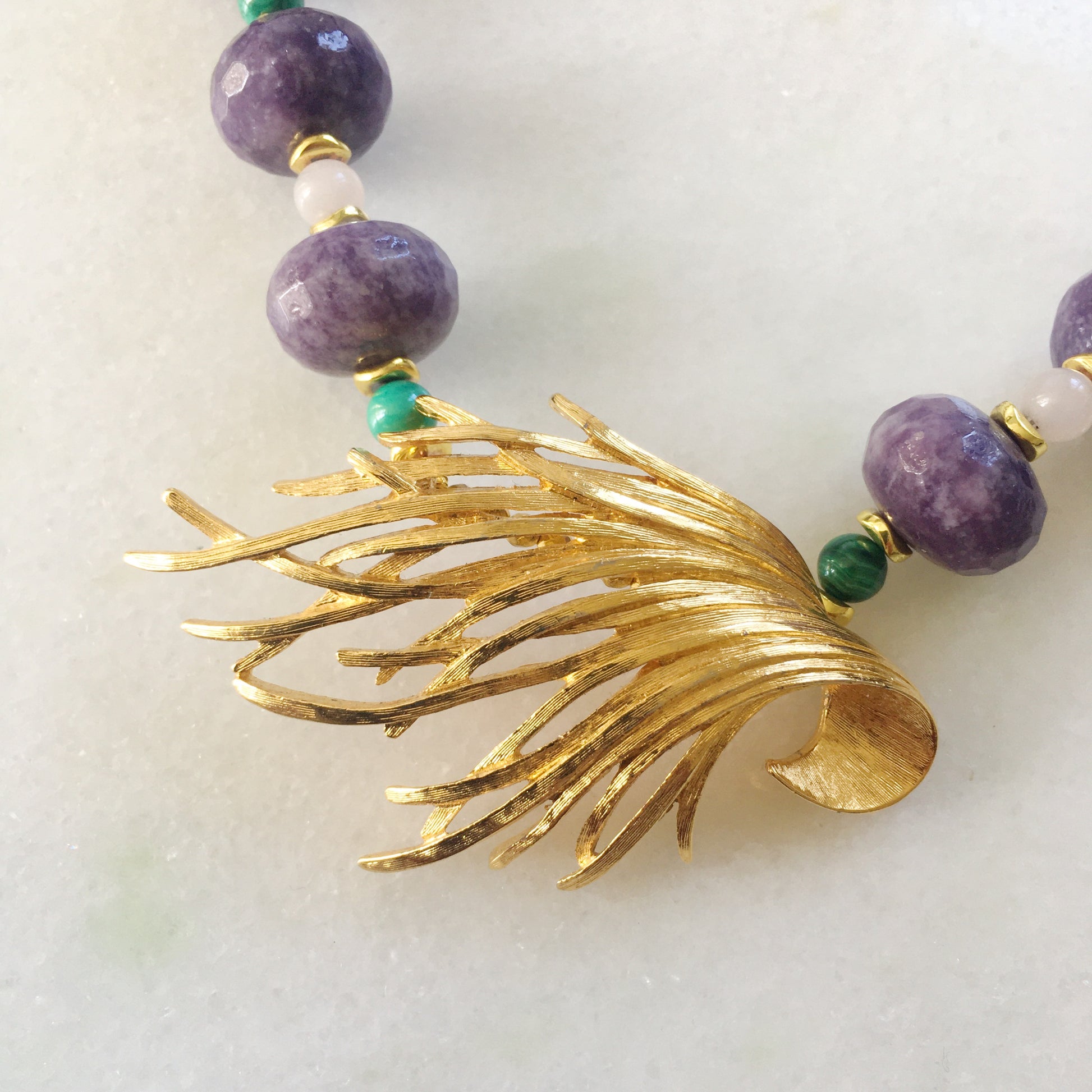 Abbiamo creato questa collana sublime con una spilla vintage firmata Monet, abbinandola ad una pietra di rara bellezza: lepidolite dai toni viola.