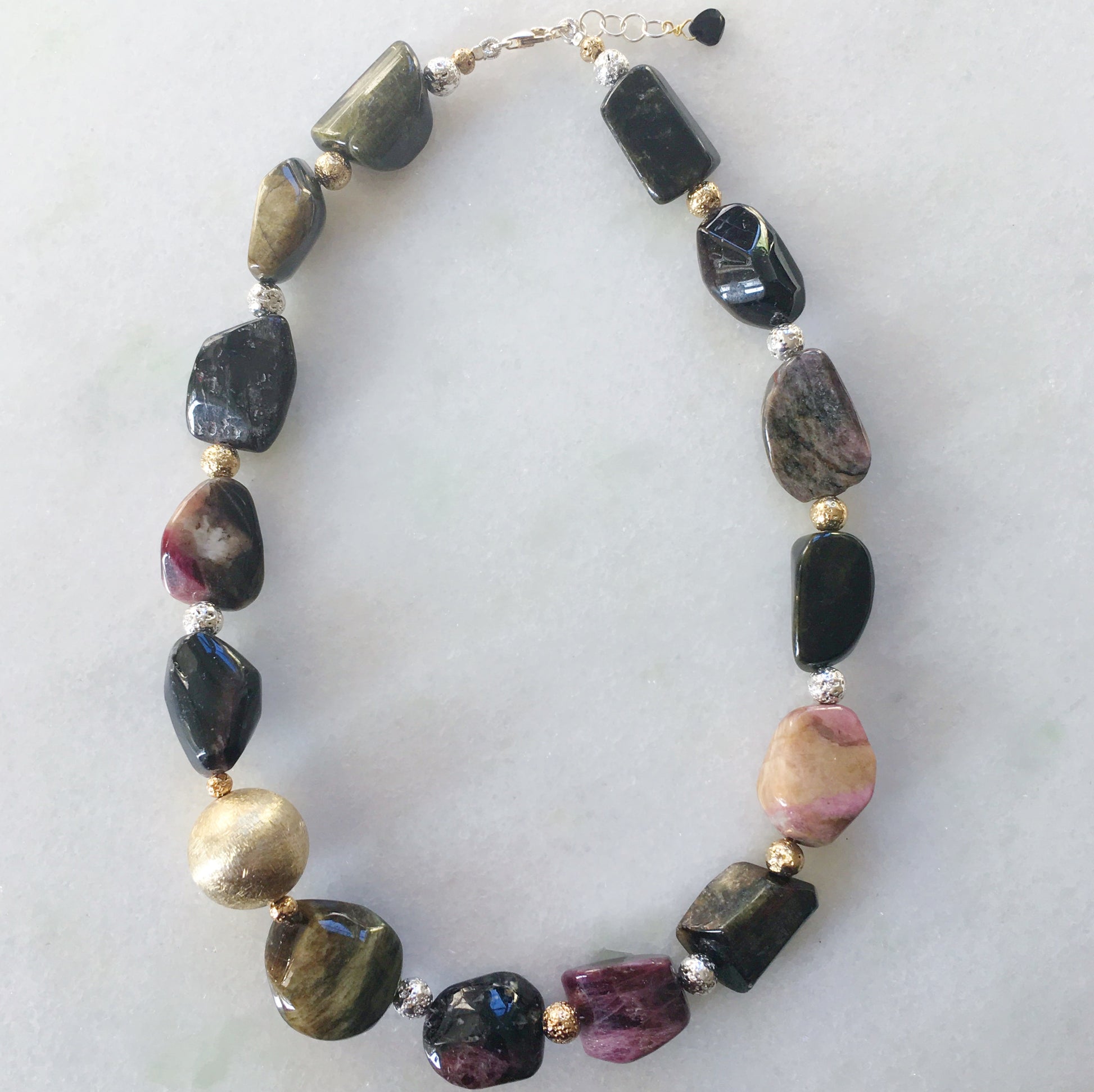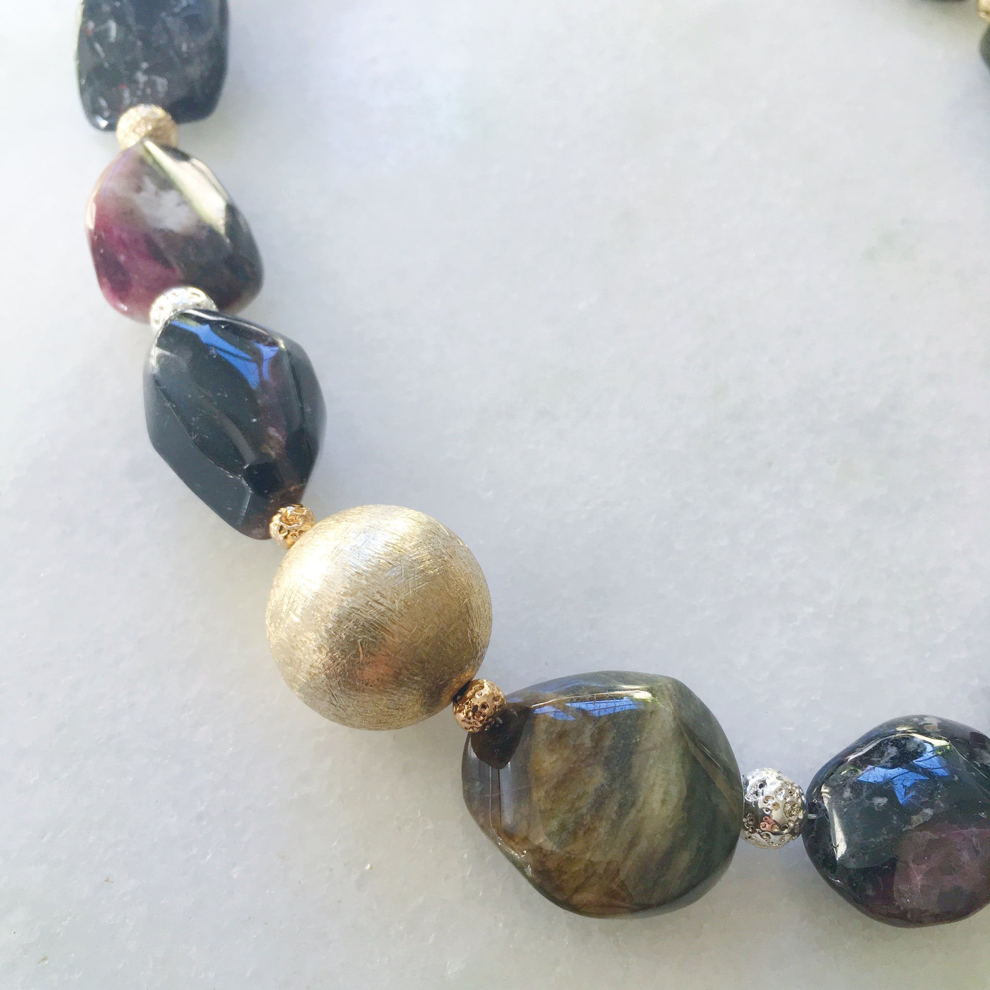 Eleganza e originalità per questa collana che abbiamo creato con tormaline dai colori rosa, marrone e nero con forme naturali irregolari.