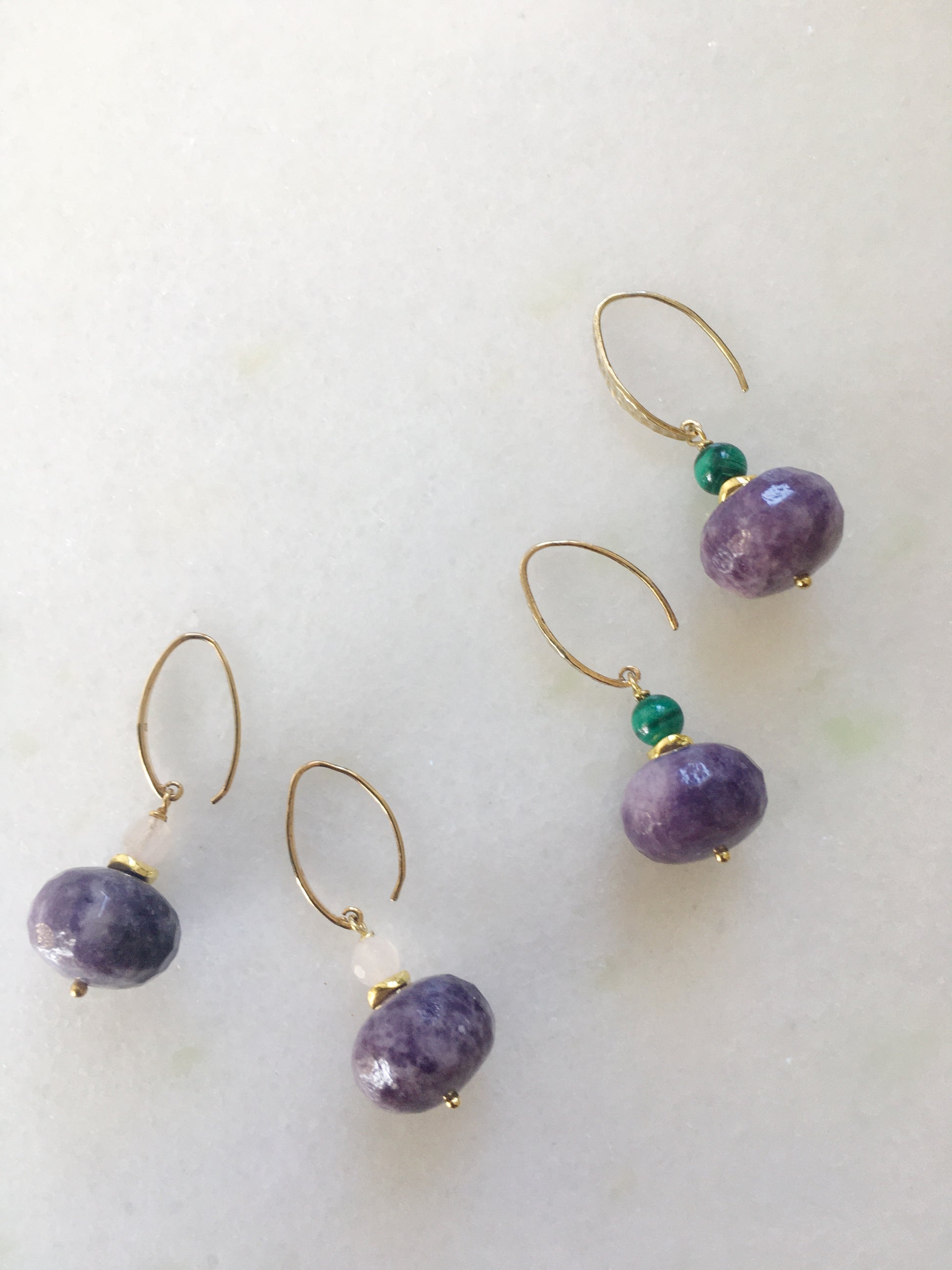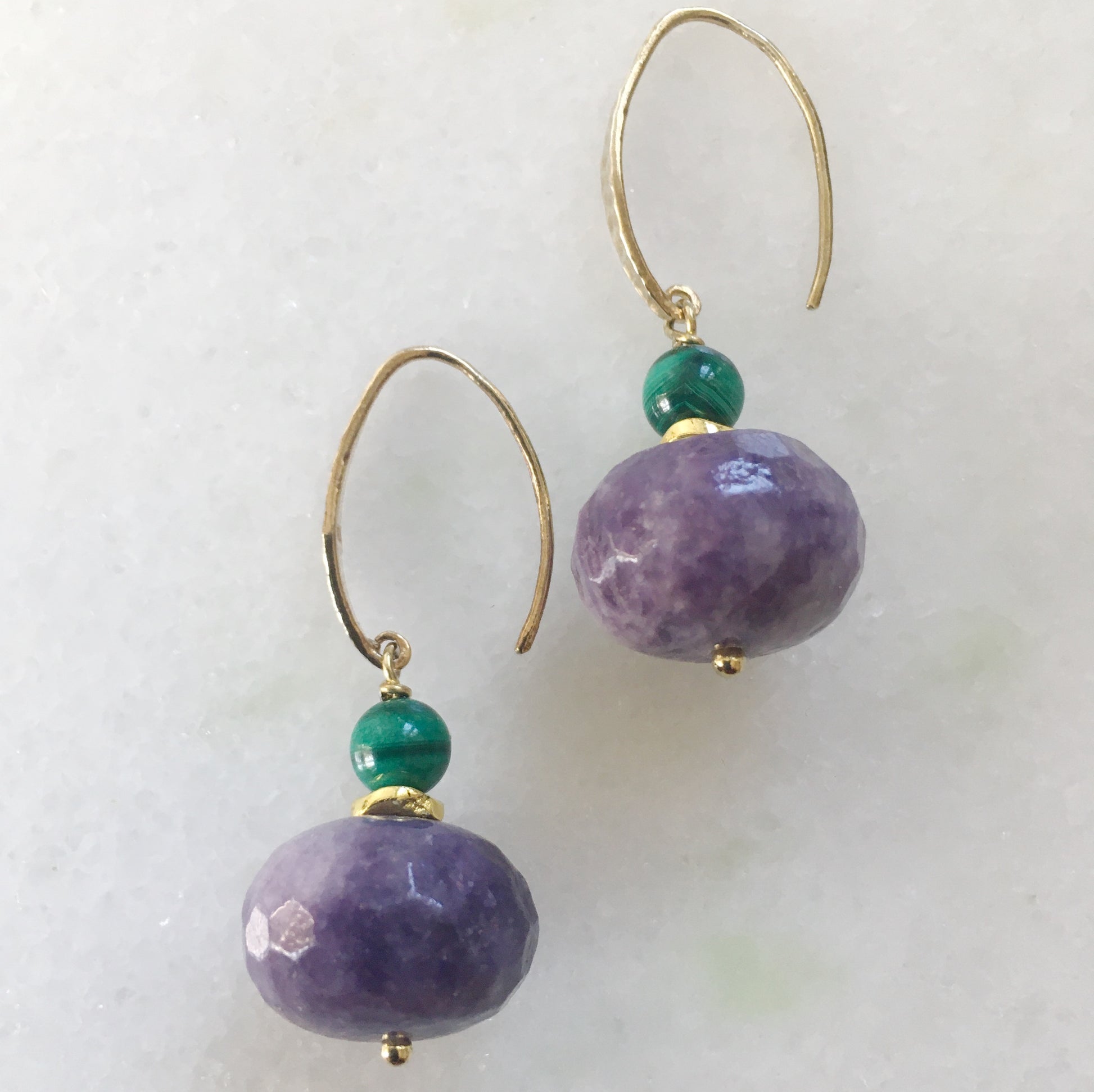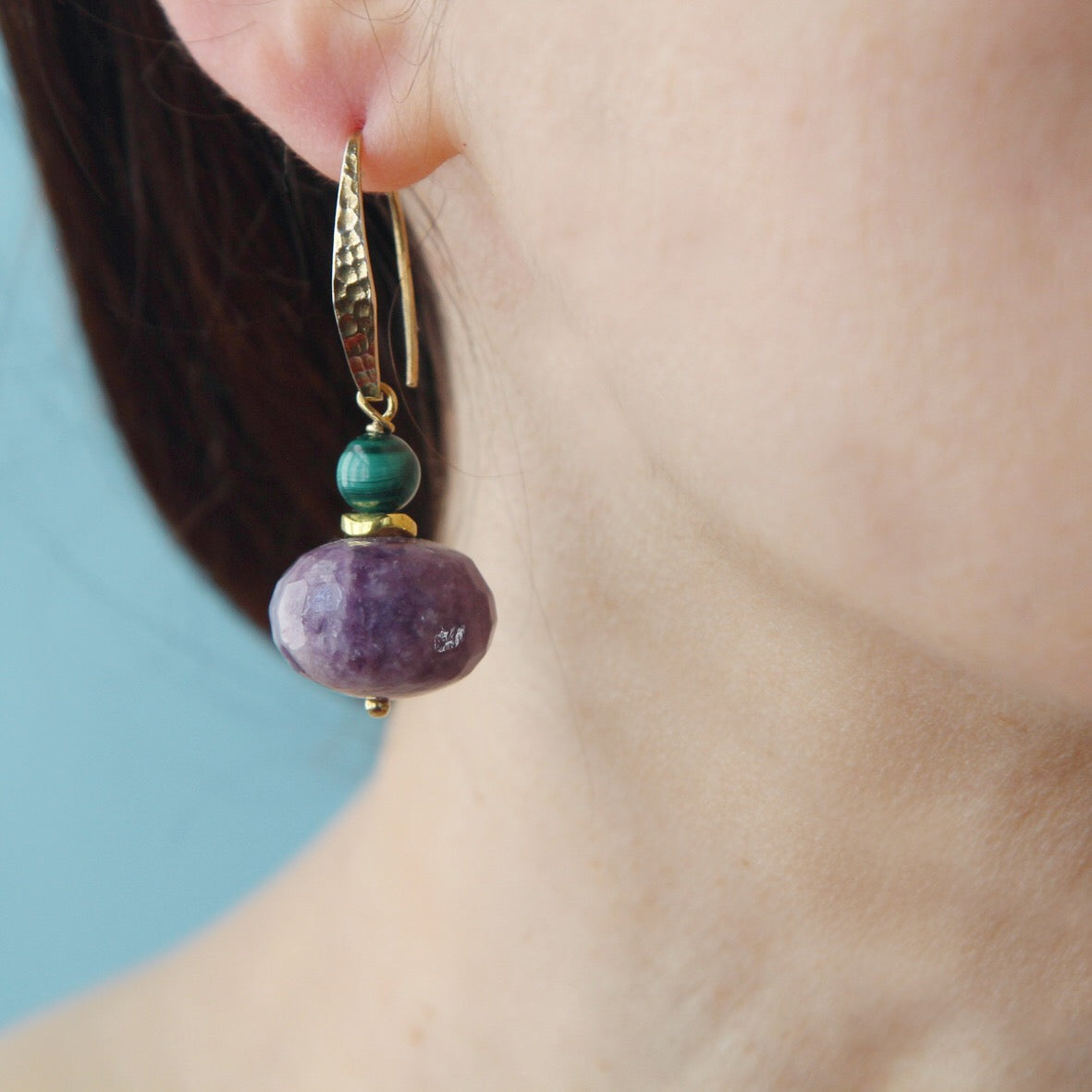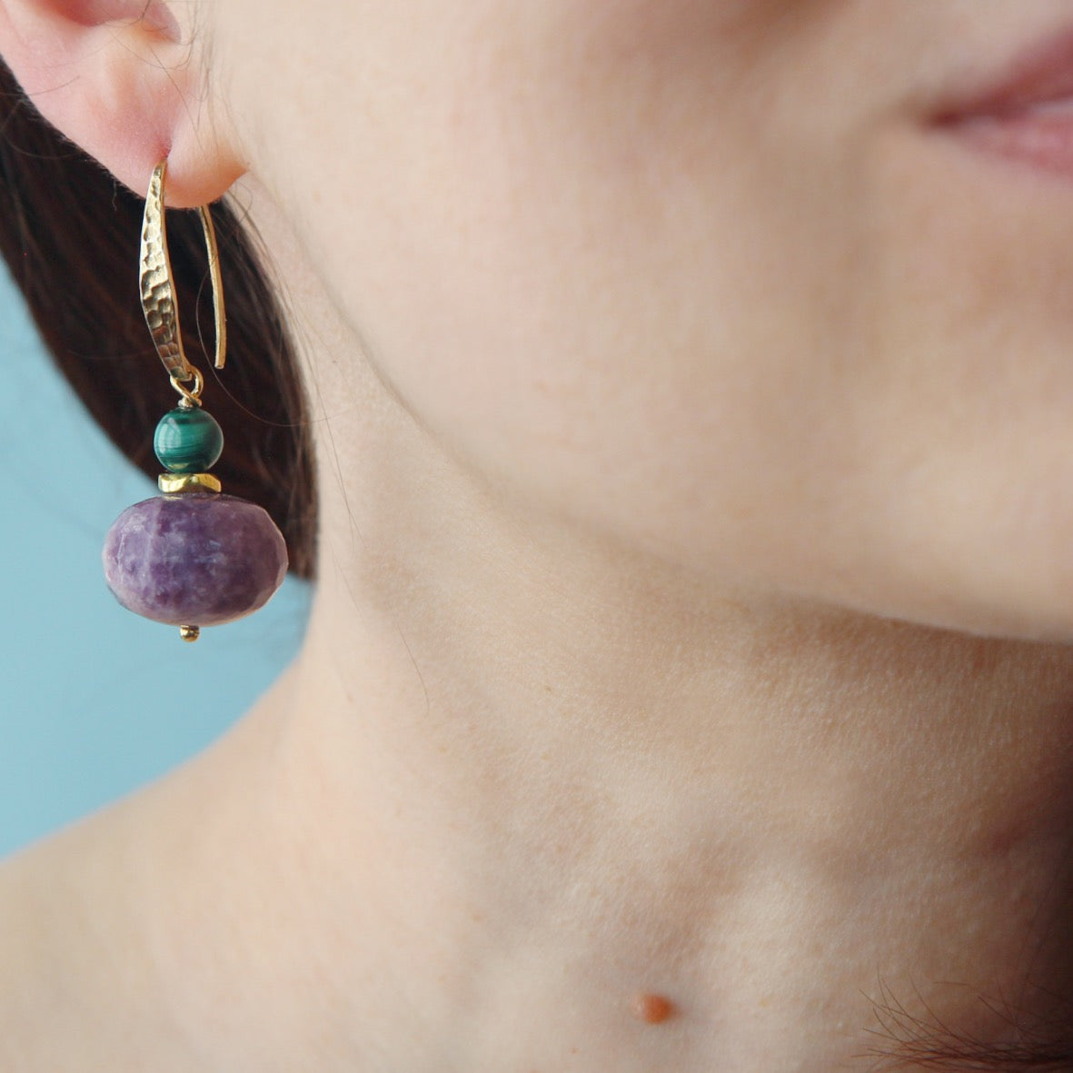 Eleganti orecchini creati con lepidolite viola, malachite verde ed ematite dorata.