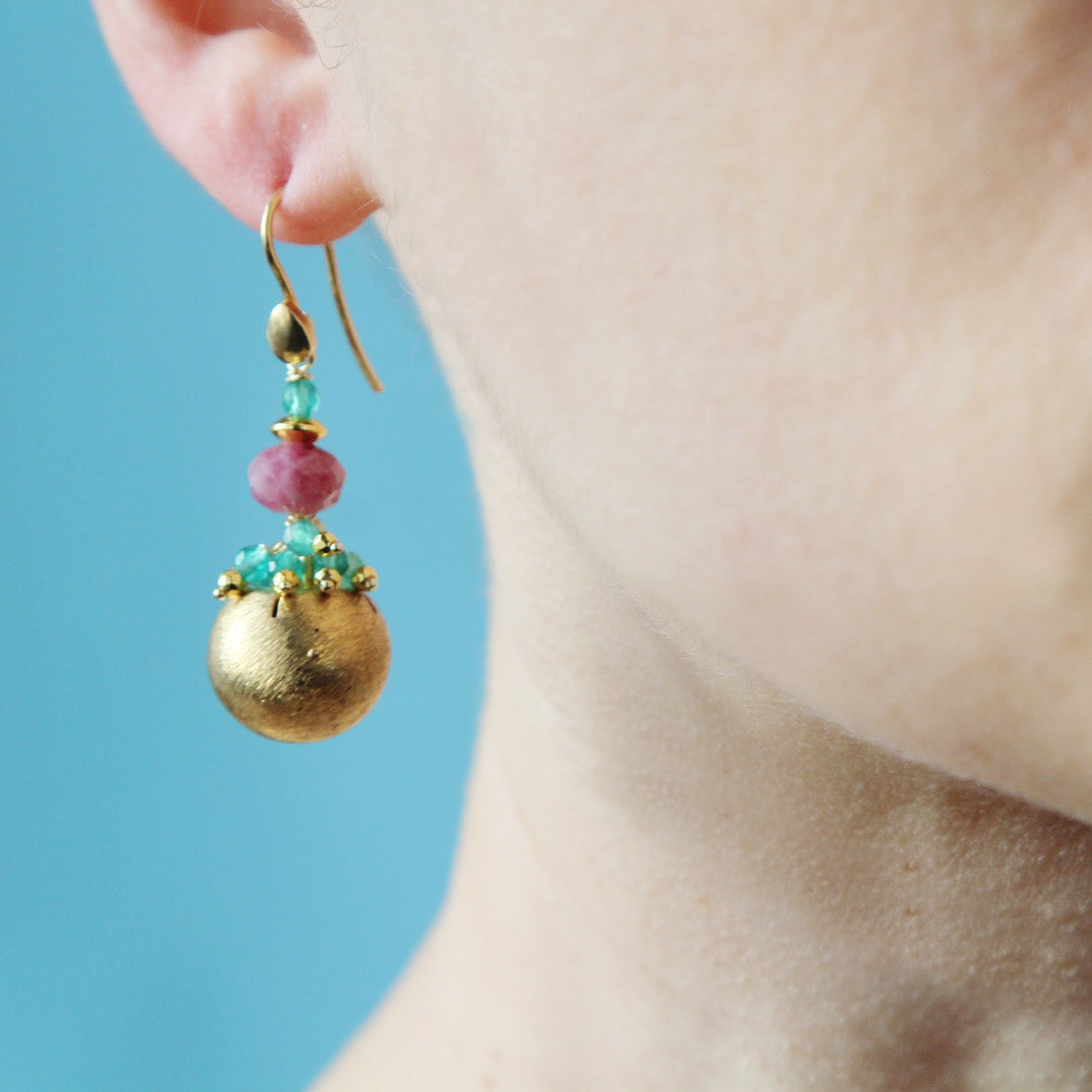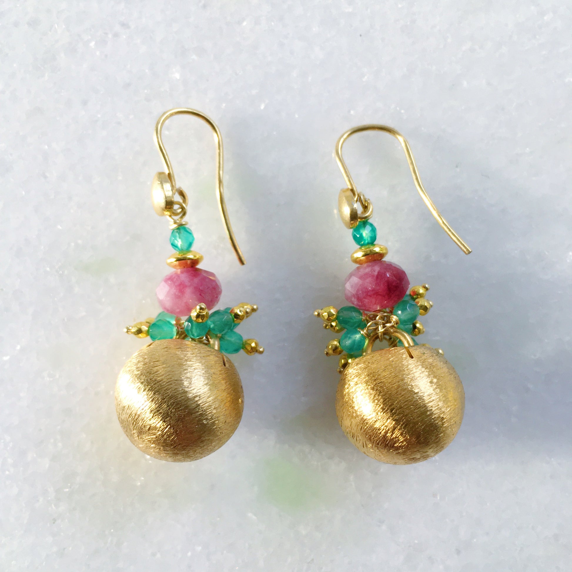 Una creazione unica con bottoncini vintage dorati, giada verde, aragonite ed ematite.