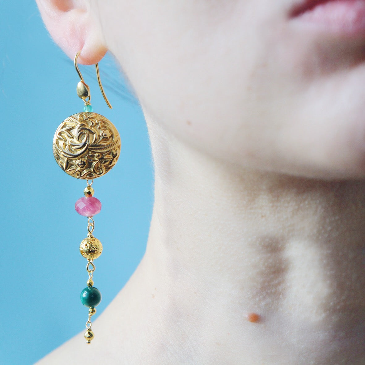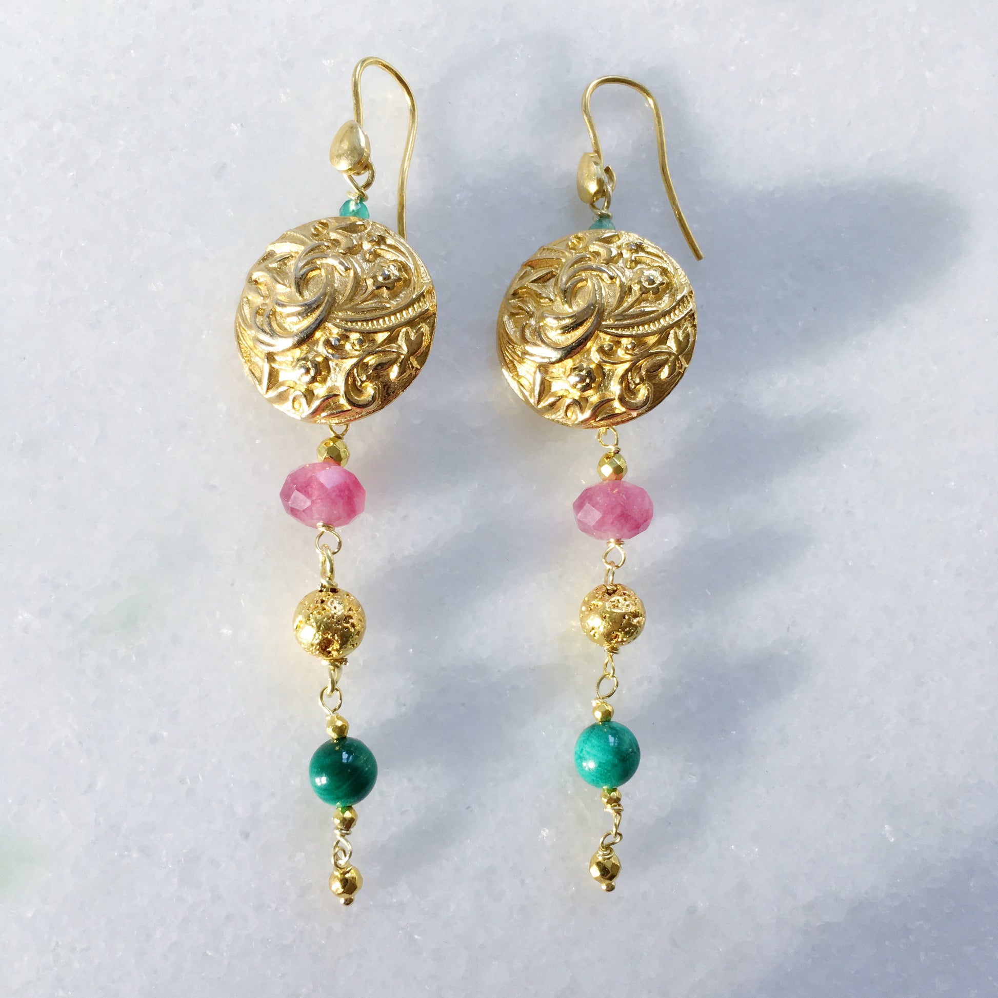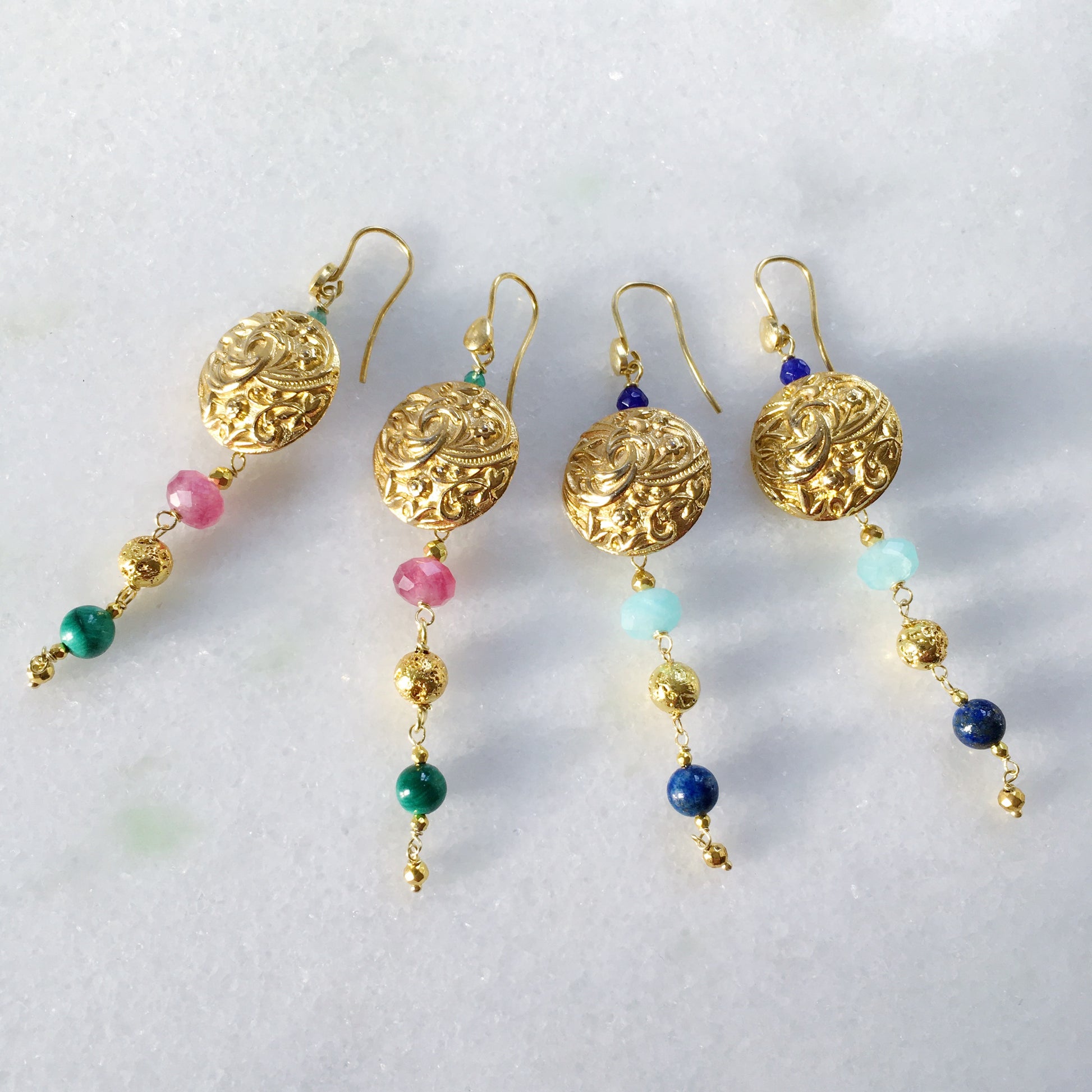 Li abbiamo creati con deliziosi bottoni vintage, aragonite, lava dorata, giada verde, malachite ed ematite.