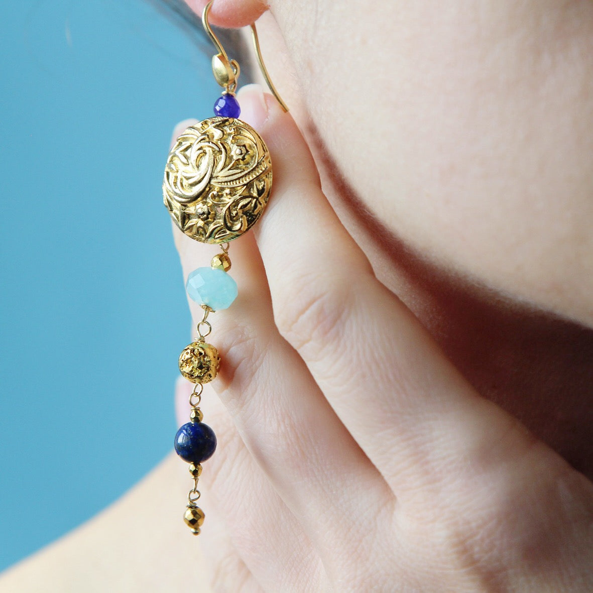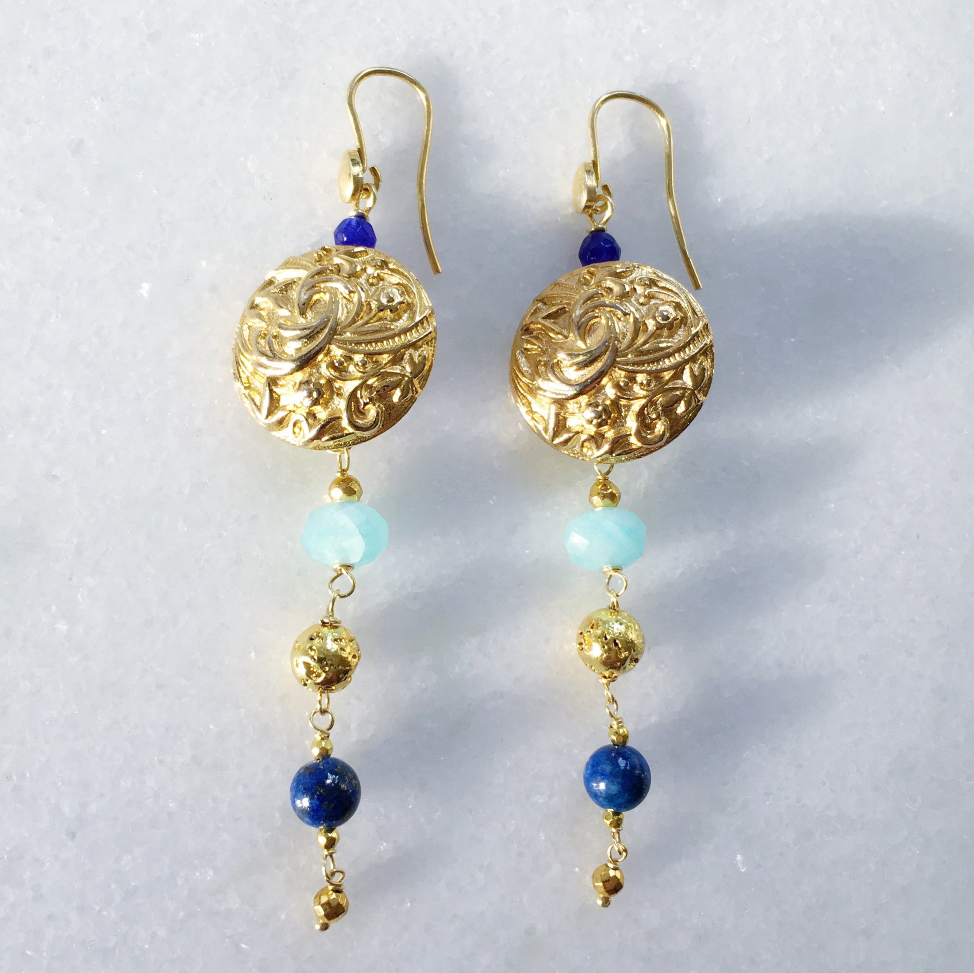 Li abbiamo creati con deliziosi bottoni vintage, lapislazzuli, lava dorata, giada, aragonite ed ematite.