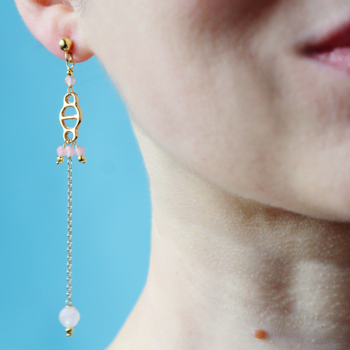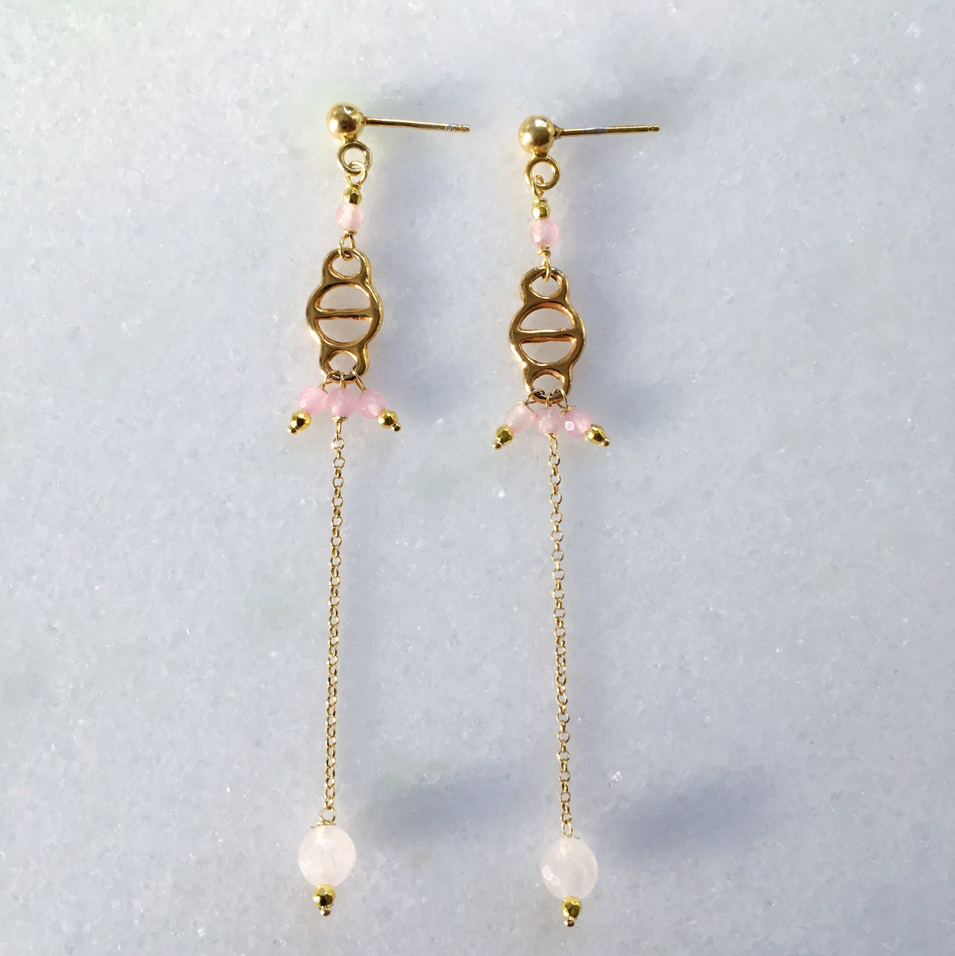 Li abbiamo creati con un inserto vintage dorato, catena in argento 925 in bagno d'oro e pietrine di quarzo rosa di diversa grandezza.