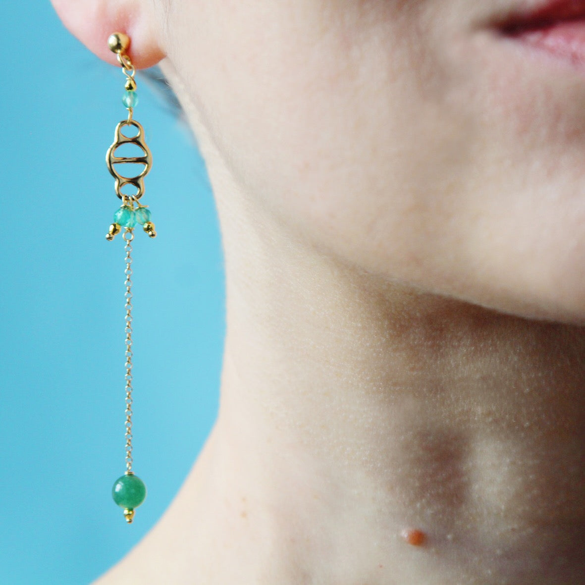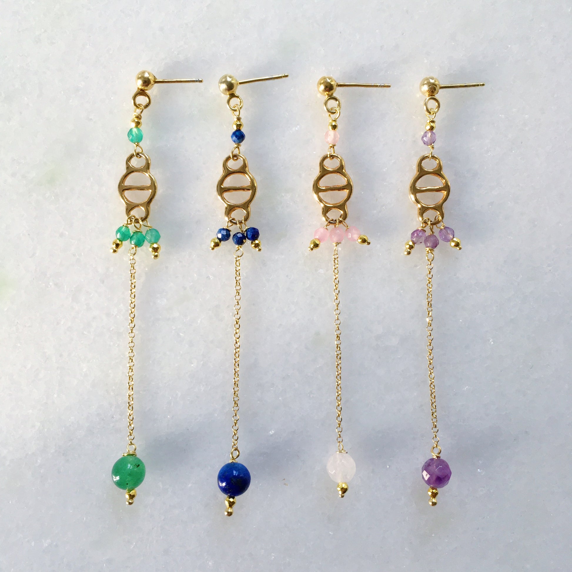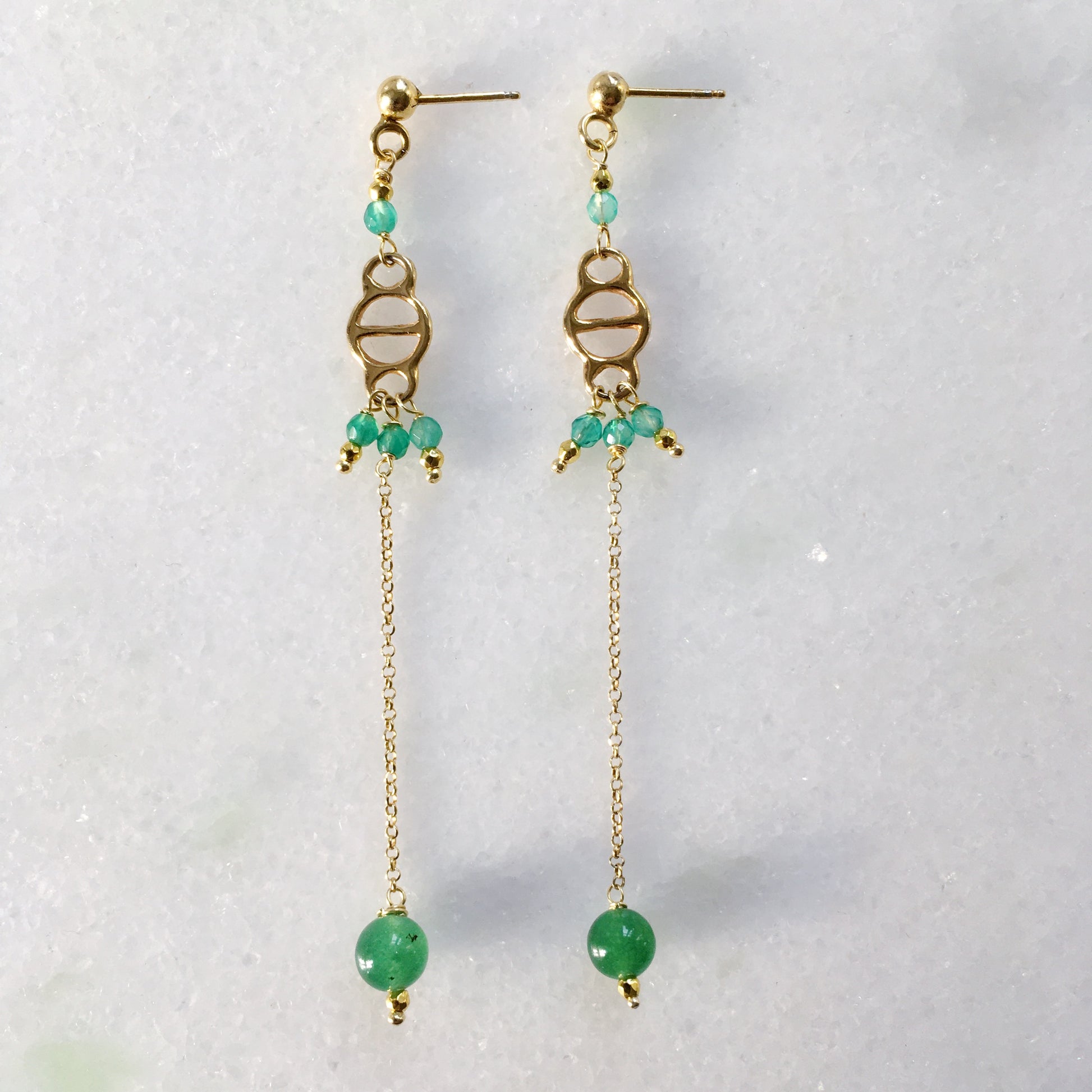 Li abbiamo creati con un inserto vintage dorato, catena in argento 925 in bagno d'oro e pietrine di giada verde di diversa grandezza.