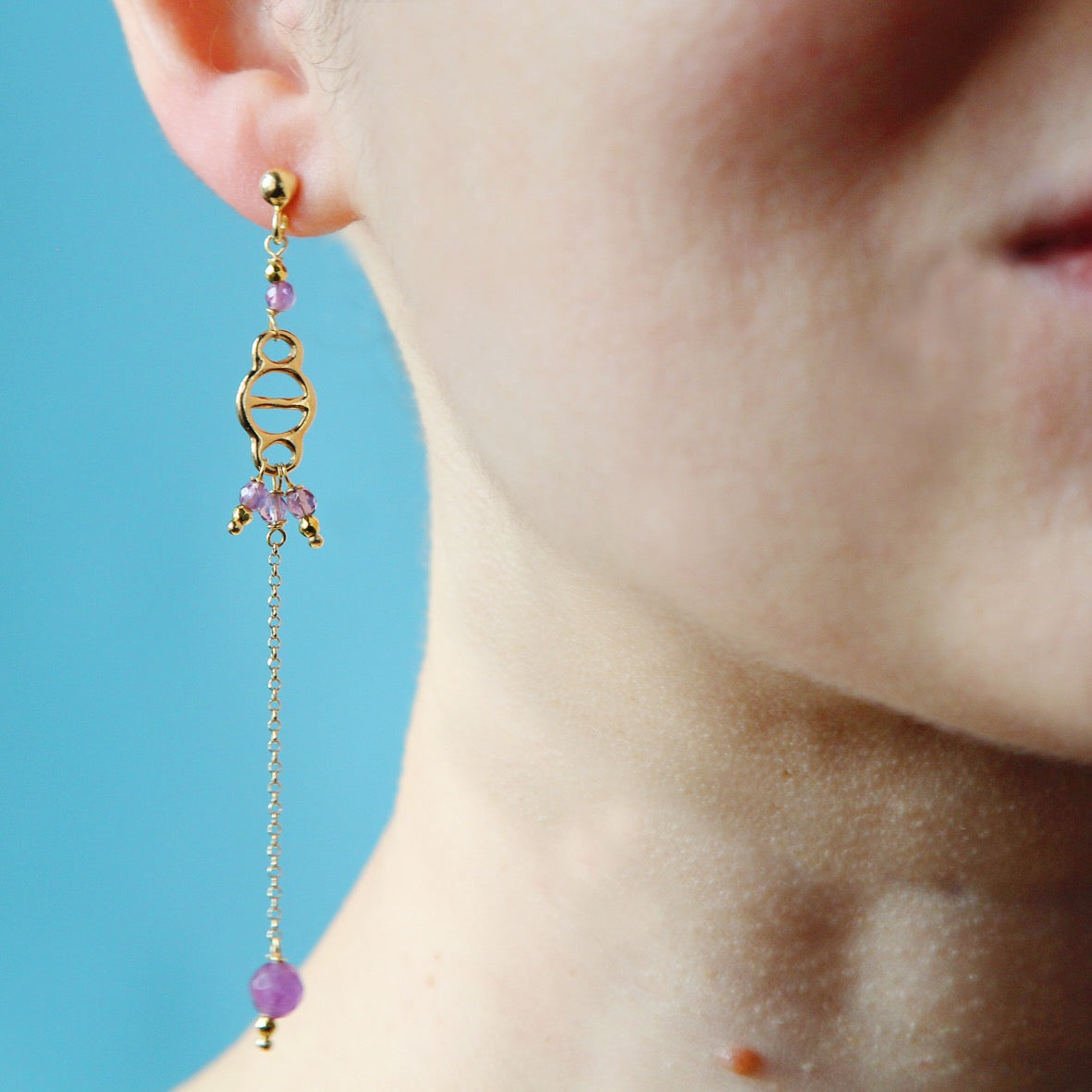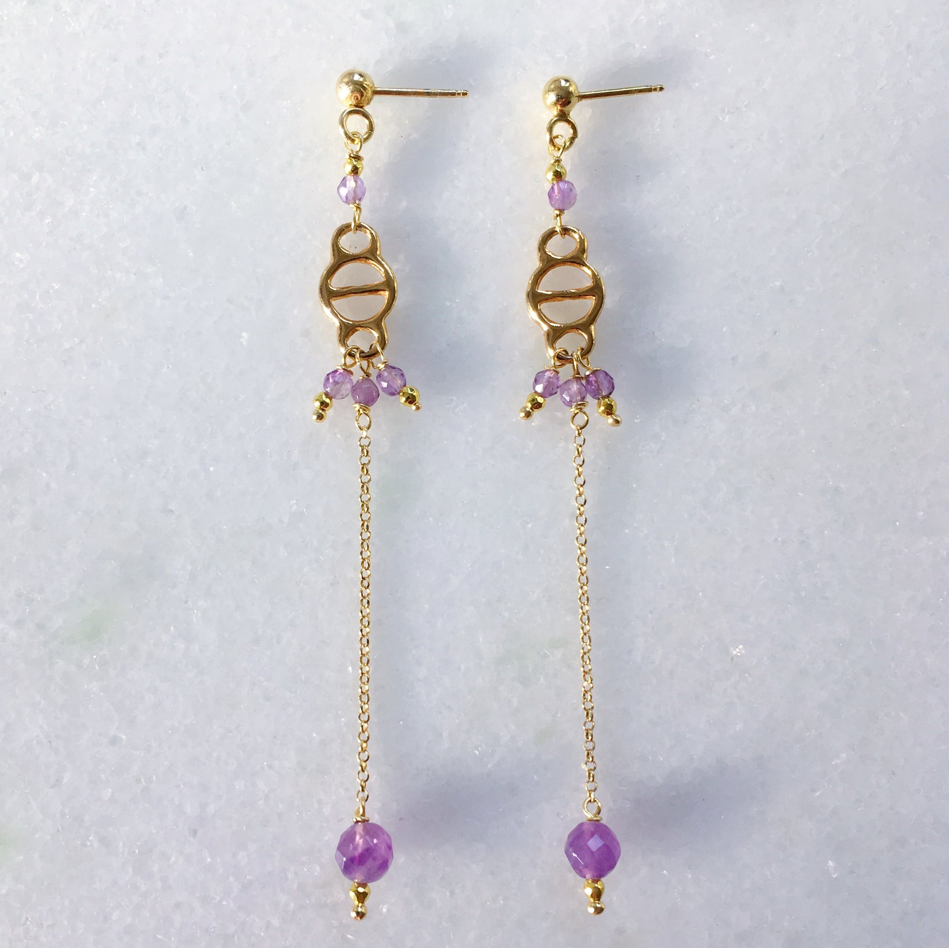 Li abbiamo creati con un inserto vintage dorato, catena in argento 925 in bagno d'oro e pietrine di ametista di diversa grandezza.