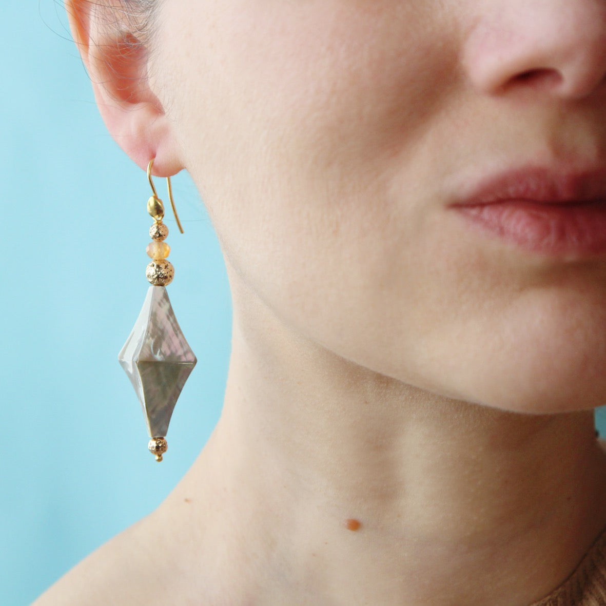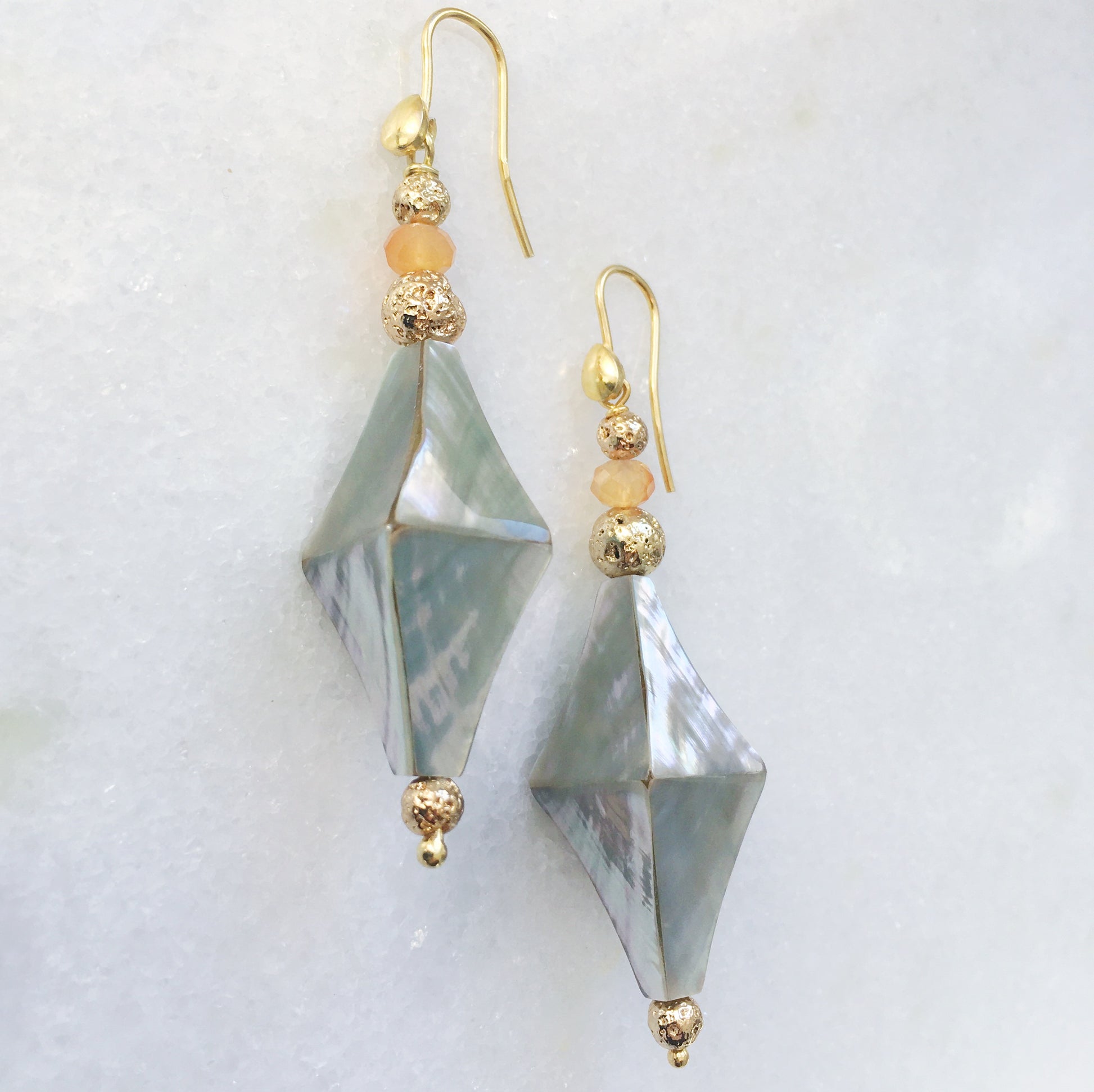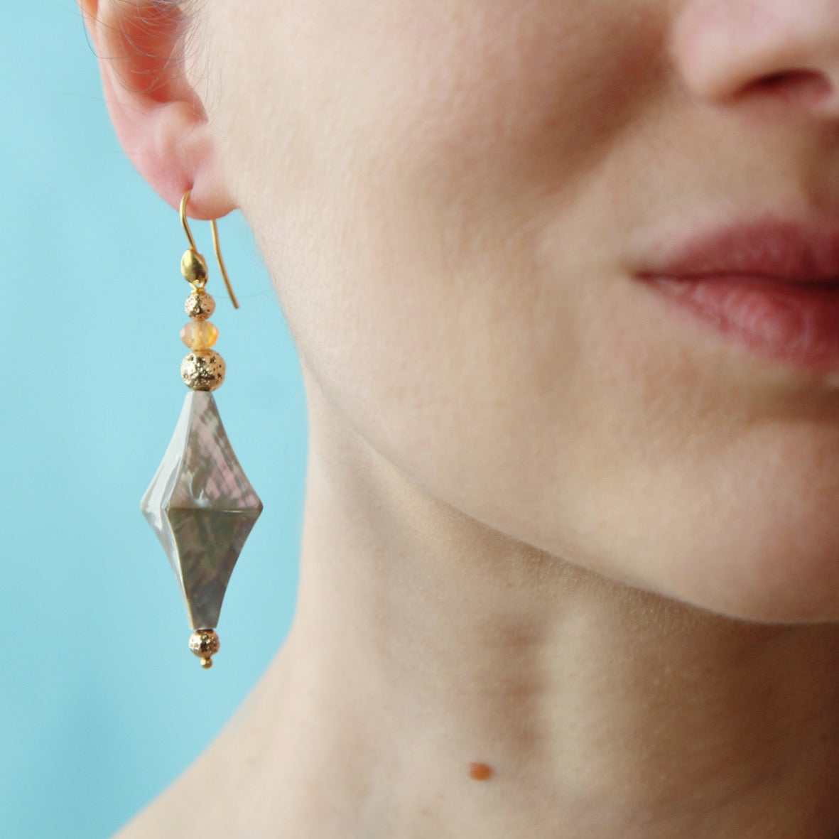 Abbiamo creato questo orecchino con una madreperla grigia cangiante, lava dorata e corniola.