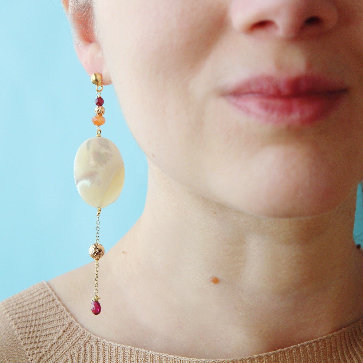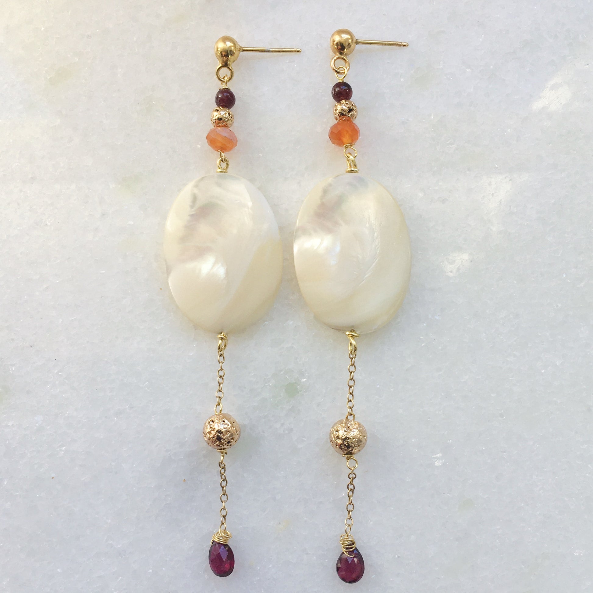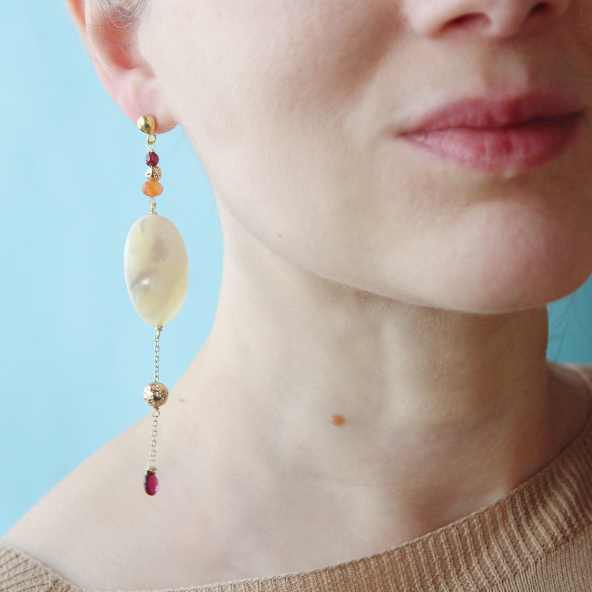 Abbiamo creato questi orecchini con due ovali in madreperla davvero cangianti.